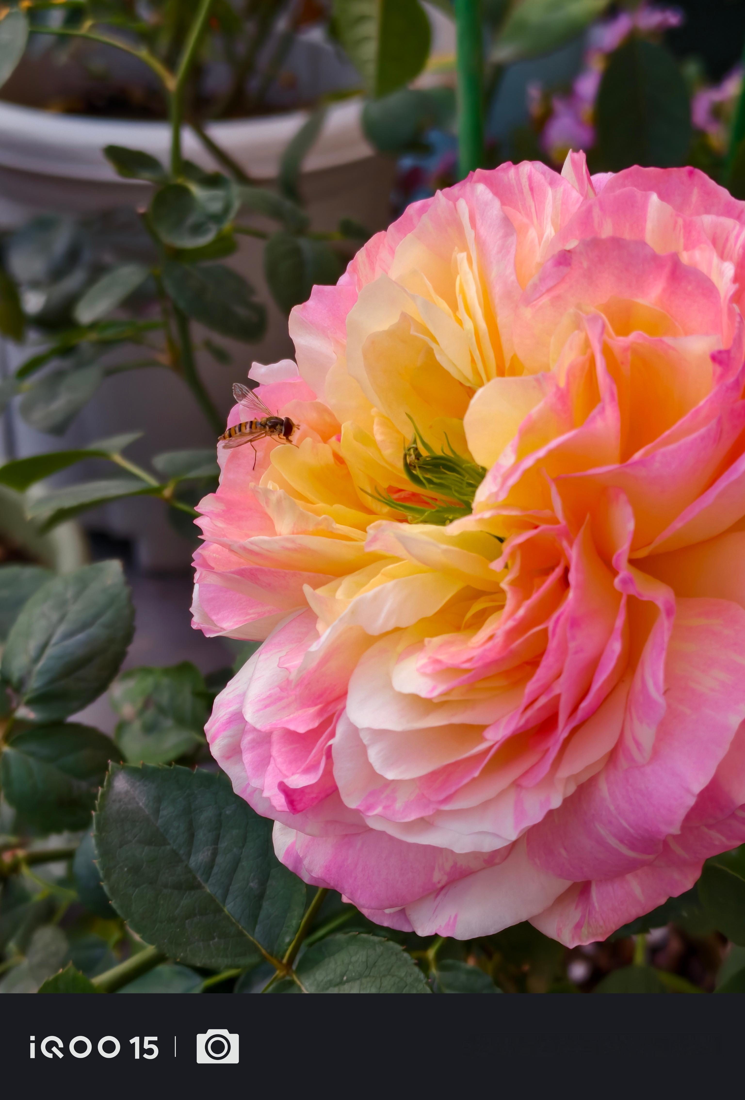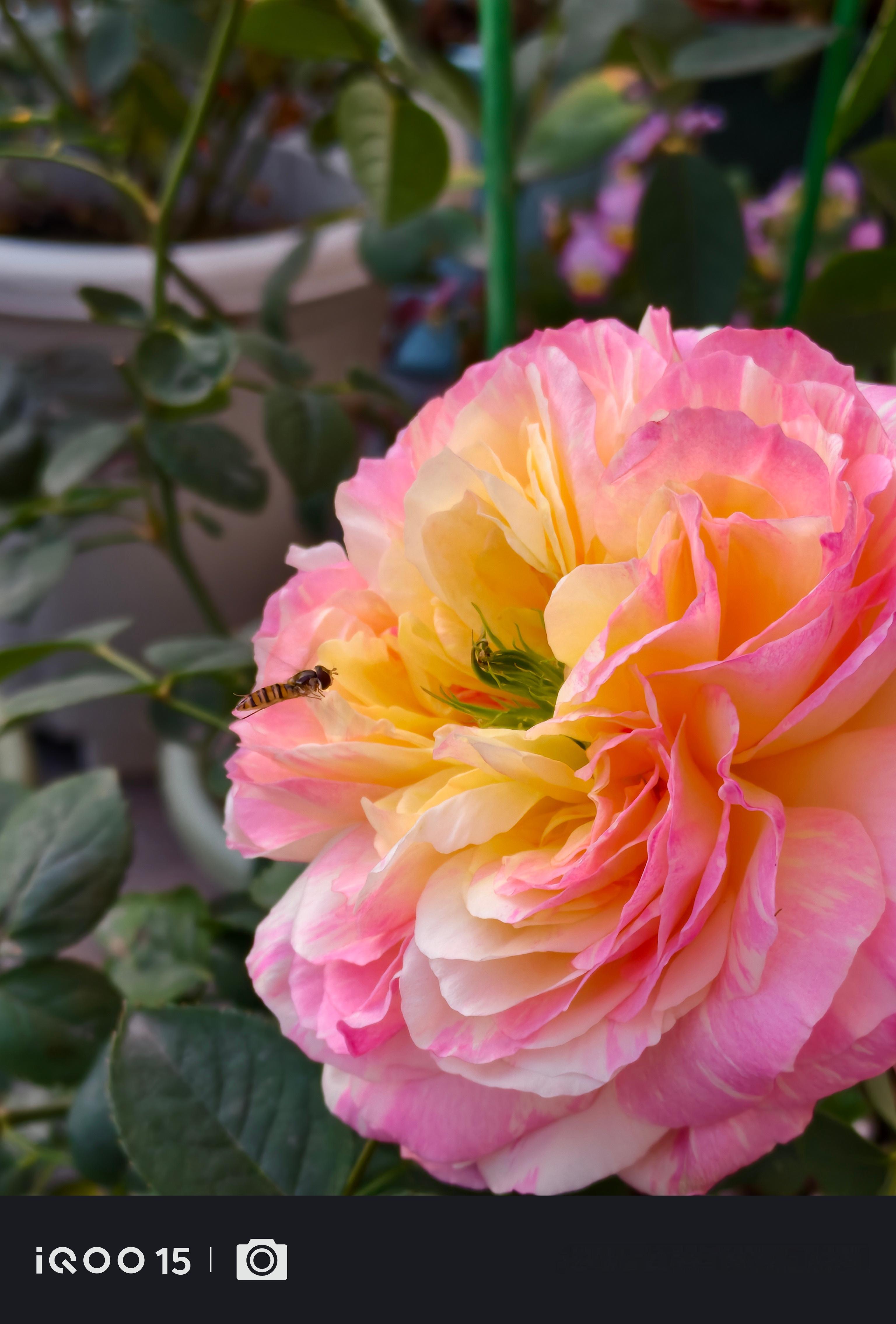 花开的真漂亮!iQOO 15瞬时捕捉蜜蜂轻盈飞动这个花颜色太绝了,粉色和黄色翻涌的热烈