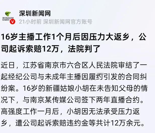 “吃人不吐骨头!”江苏南京,一家传媒公司仅用5000元,就与16岁女孩小胡(化名)签下了为期两年的独家主播合约。本以为是“明星梦”的开端,没想到女孩进入公司后,才发现等待自己的是难以承受的高强度工作,不堪重负的她趁着国庆节假期偷偷跑回了老家。可让她和家人没想到的是,等待她们的不是公司的理解,而是法院的传票——公司以女孩违约为由,将其起诉至法院,索赔高达12万元的违约金 今年刚满16岁的小胡来自新疆,怀揣着对主播行业的憧憬,瞒着父母只身前往南京闯荡。2023年9月,她与南京某传媒公司签订了艺人独家合作协议,公司仅支付了5000元签约费,就锁定了她未来两年的所有直播、商业演出等权益。合同中不仅约定线上礼物收益按四六分成、商业活动收益按六四分成,还设置了严苛的考勤要求:单次直播时长不得少于3小时,每月直播总时长需达到156小时,一旦未达标,公司有权扣除当月30%收入或按每天500元罚款 。更令人咋舌的是违约条款:若小胡提前解约,需赔偿公司拍摄费、签约费等实际损失,还要按合同期内月最高收益×剩余月数×1.3倍赔偿预期可得利益,这也成为公司索赔12万元的“依据”。 然而,这份看似光鲜的合约,背后却是对未成年人的残酷压榨。入职后,小胡每天要面对长达8小时以上的直播任务,常常熬夜到凌晨,还要应对公司的流量考核压力,身心俱疲。作为尚未成年的孩子,她的身体和心理根本无法承受如此高强度的工作,仅仅履职一个月,就已经濒临崩溃。更让人心寒的是,公司虽要求小胡提供监护人同意函,却并未核实签字真实性,在小胡姐姐代签后便直接让其上岗,完全无视《未成年人保护法》中“需征得父母或其他监护人同意”的强制性规定 。走投无路之下,小胡趁着国庆节假期偷偷返回新疆老家,直到此时,她的母亲才得知女儿独自在外签约直播的事情,当即明确表示反对。 公司见小胡迟迟不归,不仅没有反思自身问题,反而直接将其诉至南京市六合区人民法院,要求赔偿包括预期可得利益10万余元、房租及拍摄费等2万余元在内的共计12万元损失。消息传开后,网友们愤怒不已:“5000元买两年青春,违约就要赔12万,这根本就是霸王条款!”“利用未成年人涉世未深挖坑,纯属趁火打劫!”也有网友担忧:“小姑娘没背景没资源,能扛住公司的起诉吗?” 但法律终究站在正义一边。法院经审理明确指出,小胡签订合同时已满16周岁未满18周岁,无证据证明其以自己劳动收入为主要生活来源,属于限制民事行为能力人。而案涉直播合同条款复杂、违约金标准极高,与小胡的认知水平、社会经验不相适应,必须经法定代理人同意或追认后才有效。公司未核实监护人同意函的真实性,未尽到审慎审查义务,存在明显过错,因此案涉合同无效,公司主张的12万元高额违约金缺乏法律依据,不予支持 。最终,法院判决小胡返还扣除直播收益后的签约费差额3622.1元,酌定赔偿公司实际损失500元,其余损失由公司自行承担,这一判决现已生效。 值得警惕的是,这起案件并非个例。法官在审理中发现,涉事公司在2024年2月至2025年6月期间,曾以类似理由起诉过33名主播,这些主播多为刚走出校门的年轻人或未成年人,因无法承受高强度工作而停播,却被公司“批量起诉”索赔高额违约金 。此前山东济南也发生过类似事件,14岁女孩小云与MCN公司签约后,因遭遇变态管理想要解约,却被公司索赔2万余元,而她6个月仅挣了1.3万元 。这些案例暴露出部分直播公司利用未成年人心智不成熟、急于就业的心理,签订不平等合约,将“主播梦”变成“卖身契”的行业乱象。 从法律层面来看,《民法典》明确规定,限制民事行为能力人实施的超出自身能力范围的民事法律行为,需经法定代理人追认方可有效;《未成年人保护法》更是严禁网络直播服务提供者为未满16周岁未成年人提供账号注册服务,为年满16周岁未成年人提供服务时必须核实监护人同意意见 。同时,《未成年工特殊保护规定》也明确,用人单位不得安排未成年工从事“长时间保持强迫体位”的高强度作业,而长时间直播恰恰符合这一禁止性规定 。这些法律法规共同构筑起保护未成年人的“防火墙”,但部分公司为了利益铤而走险,钻法律空子,本质上是对未成年人权益的公然侵犯。 此案的判决不仅为小胡讨回了公道,也给整个直播行业敲响了警钟。直播公司不能把未成年人当作牟取暴利的工具,必须严格遵守法律法规,履行对未成年人的保护义务;平台方应健全审核机制,加强对签约主播年龄及监护人同意情况的核查,杜绝“批量签约、批量索赔”的乱象。同时,家长和学校也应加强对未成年人的教育引导,让他们认清直播行业的真实状况,提高风险防范意识,避免因盲目追梦而陷入陷阱。 各位读者你们怎么看?你认为该如何彻底遏制直播行业对未成年人的压榨?如果遇到类似的不平等合约,该如何维权?欢迎在评论区讨论。