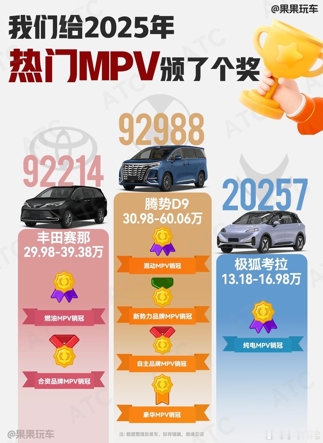 2025年MPV市场的销冠成绩单,清晰勾勒出这个细分市场的新生态,自主品牌的崛起与新能源的渗透,彻底打破了合资燃油车型一家独大的旧格局。腾势D9以92988台的销量拿下混动、新势力、自主品牌及豪华MPV四项销冠,30.98万-60.06万的价格区间,精准覆盖了中高端家用与商务场景。其核心优势在于把DM-i混动技术的节能性、大空间的实用性和豪华内饰的体验感做了深度融合,既解决了传统燃油MPV油耗高的痛点,又避开了纯电MPV续航焦虑的短板,这也是自主品牌能在高端MPV领域站稳脚跟的关键——不再是简单的配置堆砌,而是对用户需求的精准拆解与技术落地。丰田赛那92214台的销量守住燃油与合资品牌销冠,29.98万-39.38万的定价依旧抓住了传统用户对合资品牌口碑、燃油动力可靠性的信任,但从销量差距和市场趋势来看,燃油MPV的增长天花板已现,合资品牌还得加速向新能源转型。极狐考拉20257台的销量斩获纯电MPV销冠,13.18万-16.98万的亲民定价,瞄准了城市短途家用的细分需求,尤其是针对母婴出行的专属设计,让纯电MPV找到了差异化的破局点。尽管目前纯电MPV整体市场体量尚小,但这种精准的场景化产品打造,也为纯电MPV的未来发展提供了清晰思路。整体来看,2025年MPV市场已进入“技术赋能场景”的新阶段,不同动力、不同价位的车型各有赛道,而自主品牌凭借对新能源技术的掌控和用户需求的洞察,正成为这场变革的核心主导者。大v聊车