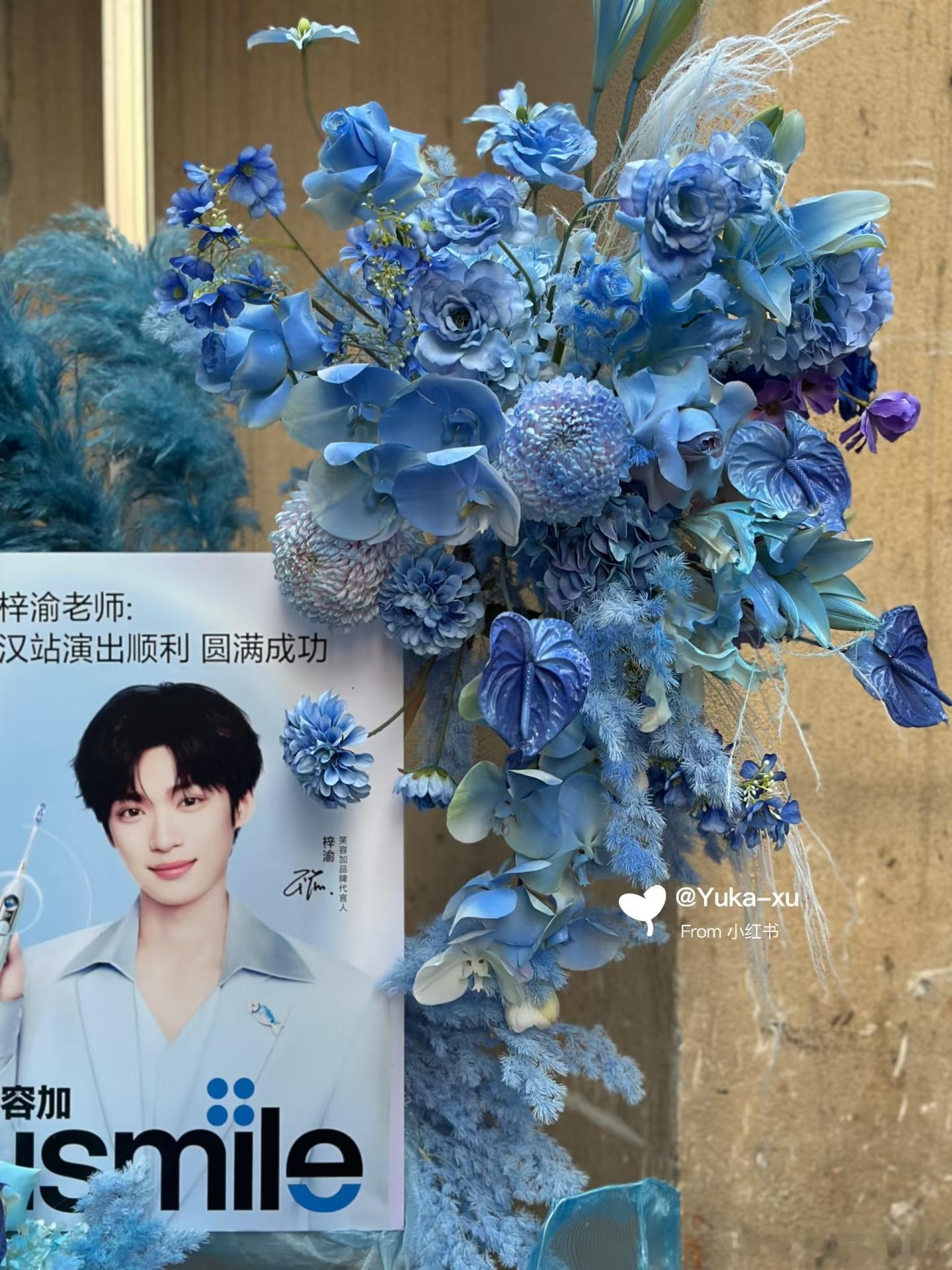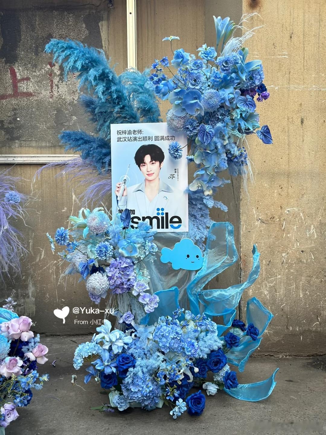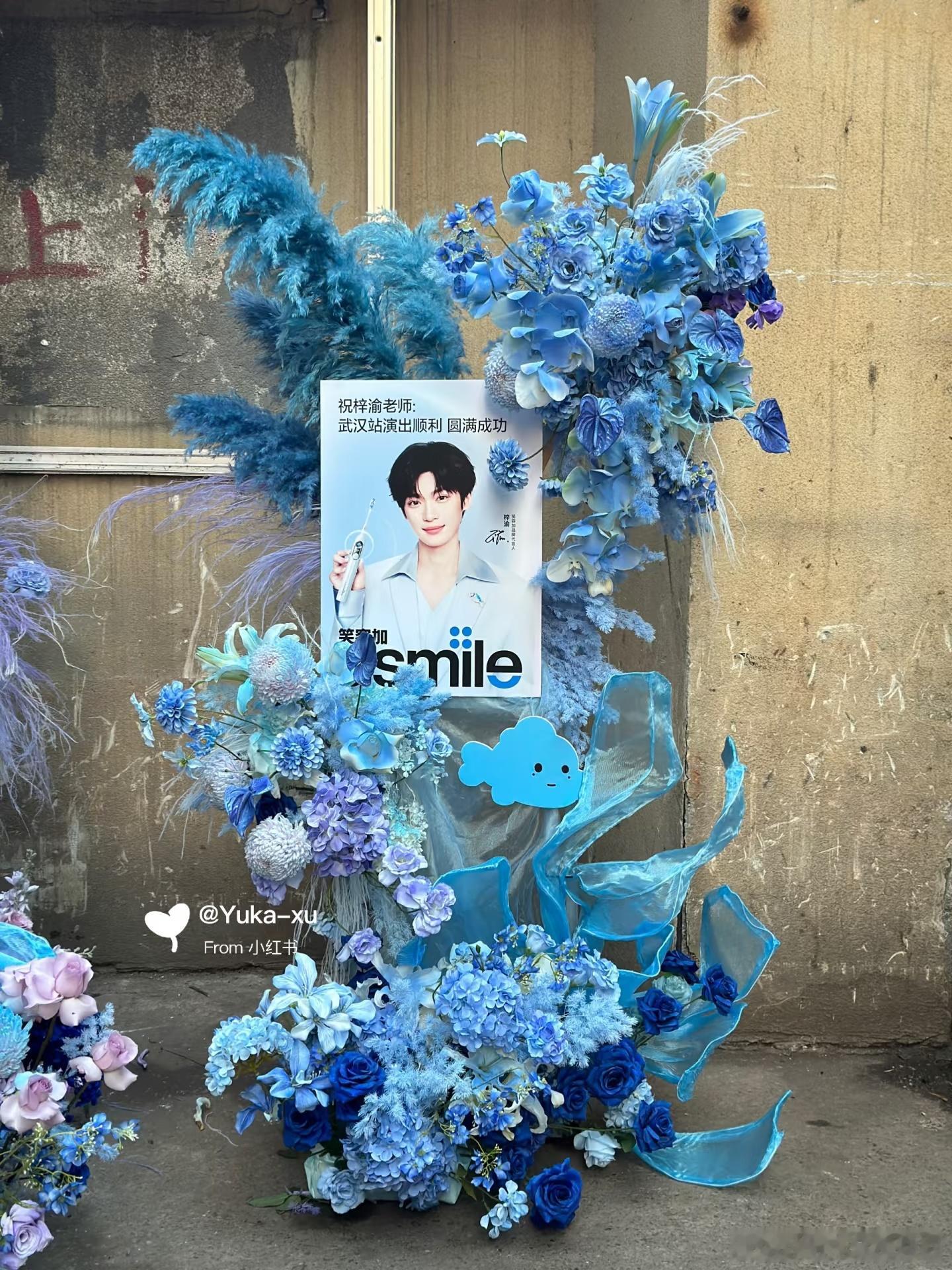 梓渝工作室 何意味笑容加今晚武汉演唱会的花篮真的好漂亮寓意:以🐟为元素,他的环境可以是一汪清泉,亦可以是大海。选用的蓝色永生蓬莱松和芦荀草质感有点海底珊瑚和水草。一支可爱小鱼的旅行,一路乘风破浪。🌊每次演唱会ppf的花篮都特别用心