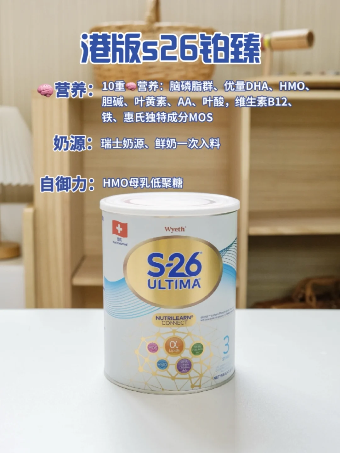 ✅港版S26铂臻:添加10重营养,优量DHA+HMO+脑磷脂群的黄金营养组合,加上叶黄素、叶酸、胆碱、维生素B12、AA、铁、惠氏独特成分MOS,各成分相互协同,可以帮助DHA加速吸收,[飞盘R]给宝宝成长提供满满的动力支持。