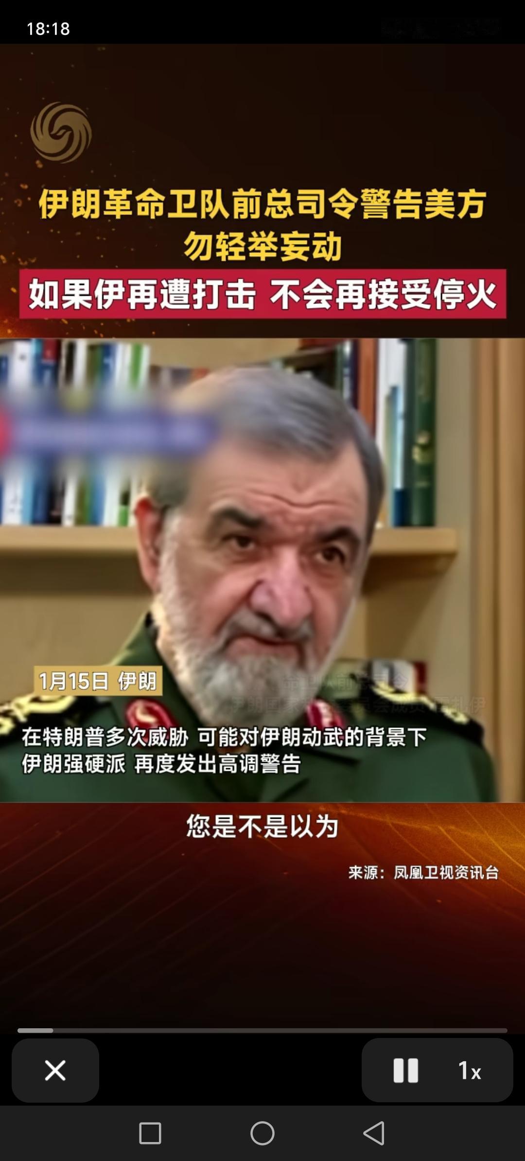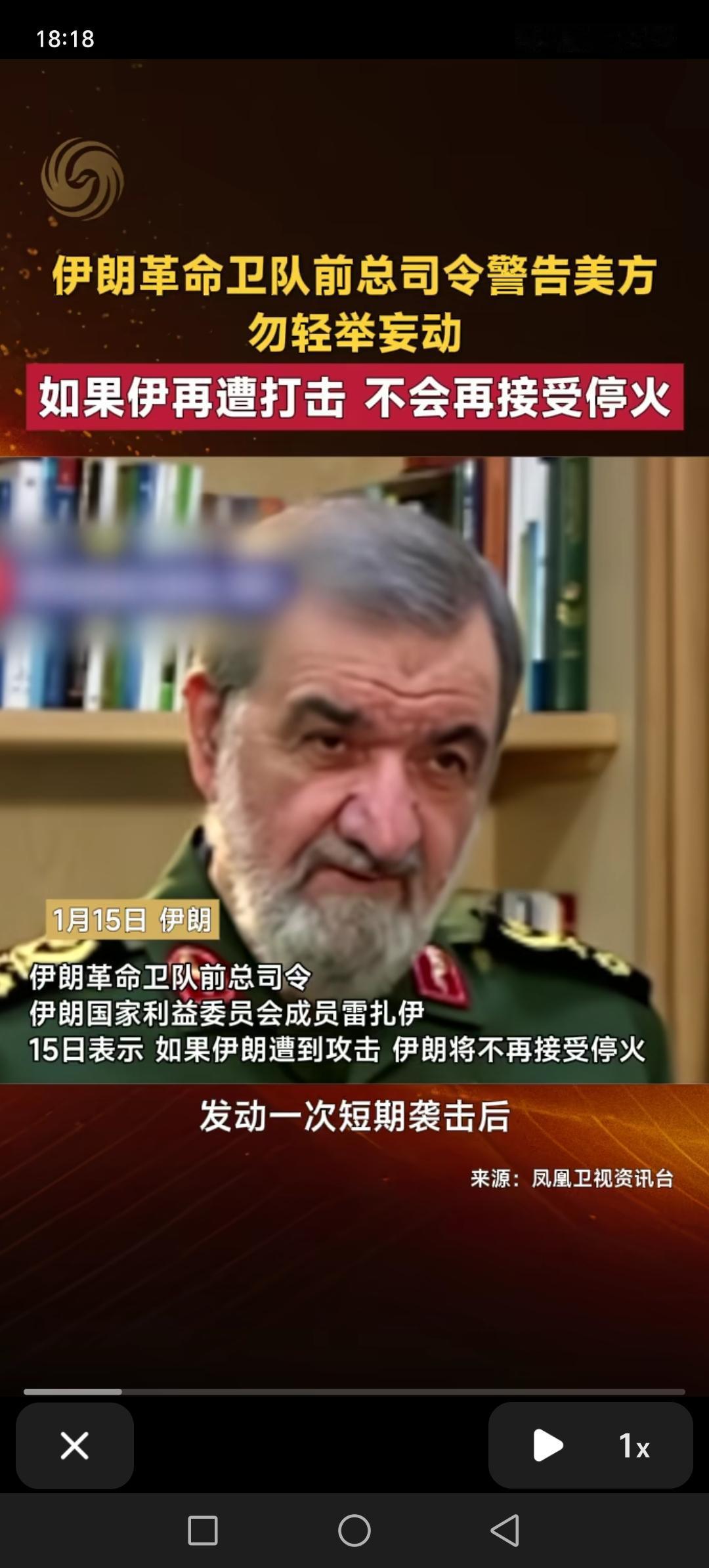 1月15日,伊朗革命卫队前总司令雷扎伊警告美国,不要轻举妄动,如果伊朗再遭到打击,不会再接受停火。这是伊朗鹰派人物,发出了严厉警告。伊朗不能像以前一样,你打我说停就停,这次如果再接受打击,将会一直打下去,要打多久打多久,直到完全胜利为止。 以前以色列和美国和伊朗打仗,只要有人出面调停,伊朗就接受停,这一次不同了。不能一而再,再而三,让美国欺负。你打我可以,但是想结束,你说了不算。