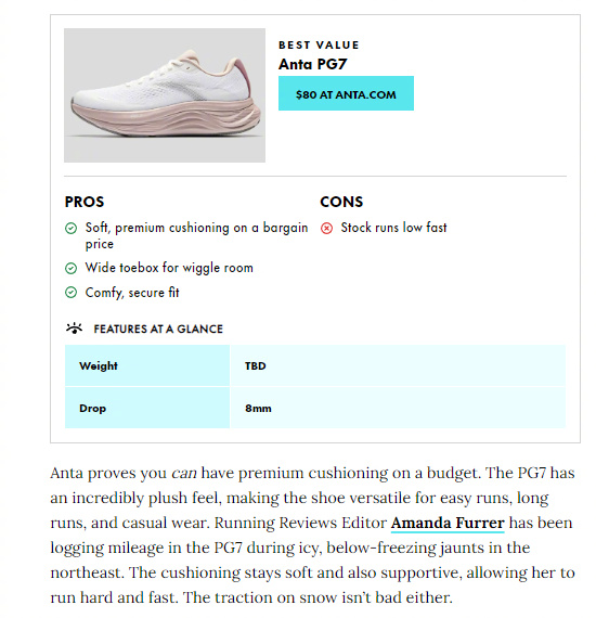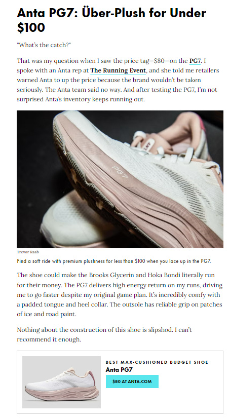 ANTA RUNNING近日,世界知名跑鞋媒体《Runner's World》(跑者世界)公布了2025年度最佳跑鞋榜单,在这份榜单中,中国运动品牌安踏的PG7(旅步)被《跑者世界》评为了100美金以下最舒适的跑鞋。在上榜理由中,跑者世界说到PG7极其舒适的脚感让Brooks Glycerin和Hoka Bondi在它面前都会相形见绌。同时他们也谈到了在今年的The Running Event跑鞋大会上,他们曾经和安踏品牌的团队建议过应该把PG7的价格定高些,但是安踏团队拒绝了。的确,在今年的跑鞋大会后,国外很多的跑鞋媒体都关注到了安踏的跑鞋,并且也都开始自发的评测C202 7等安踏跑鞋,评测后也都给予了很高的评价。看来踏子的出海要成了