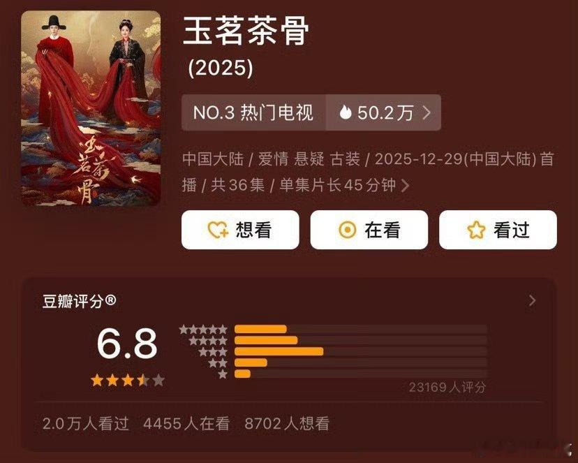 《玉茗茶骨》豆瓣评分开分6.8分。于正又岀了一部扑街烂剧