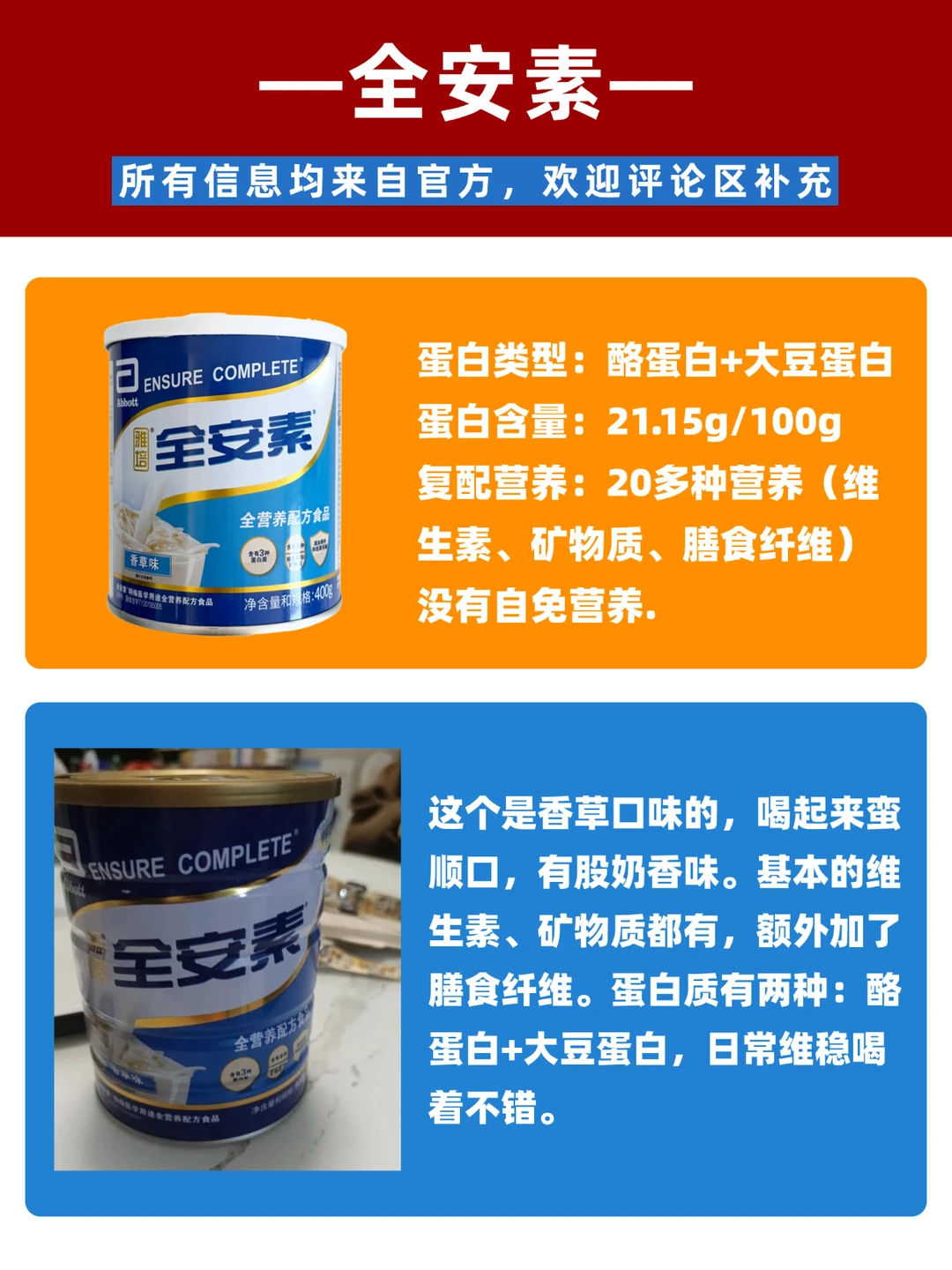 ③全安素:喝起来蛮顺口,是奶香味,基本的维生素矿物质都有,还有两种蛋白质:酪蛋白+大豆蛋白,日常维稳喝着不错。