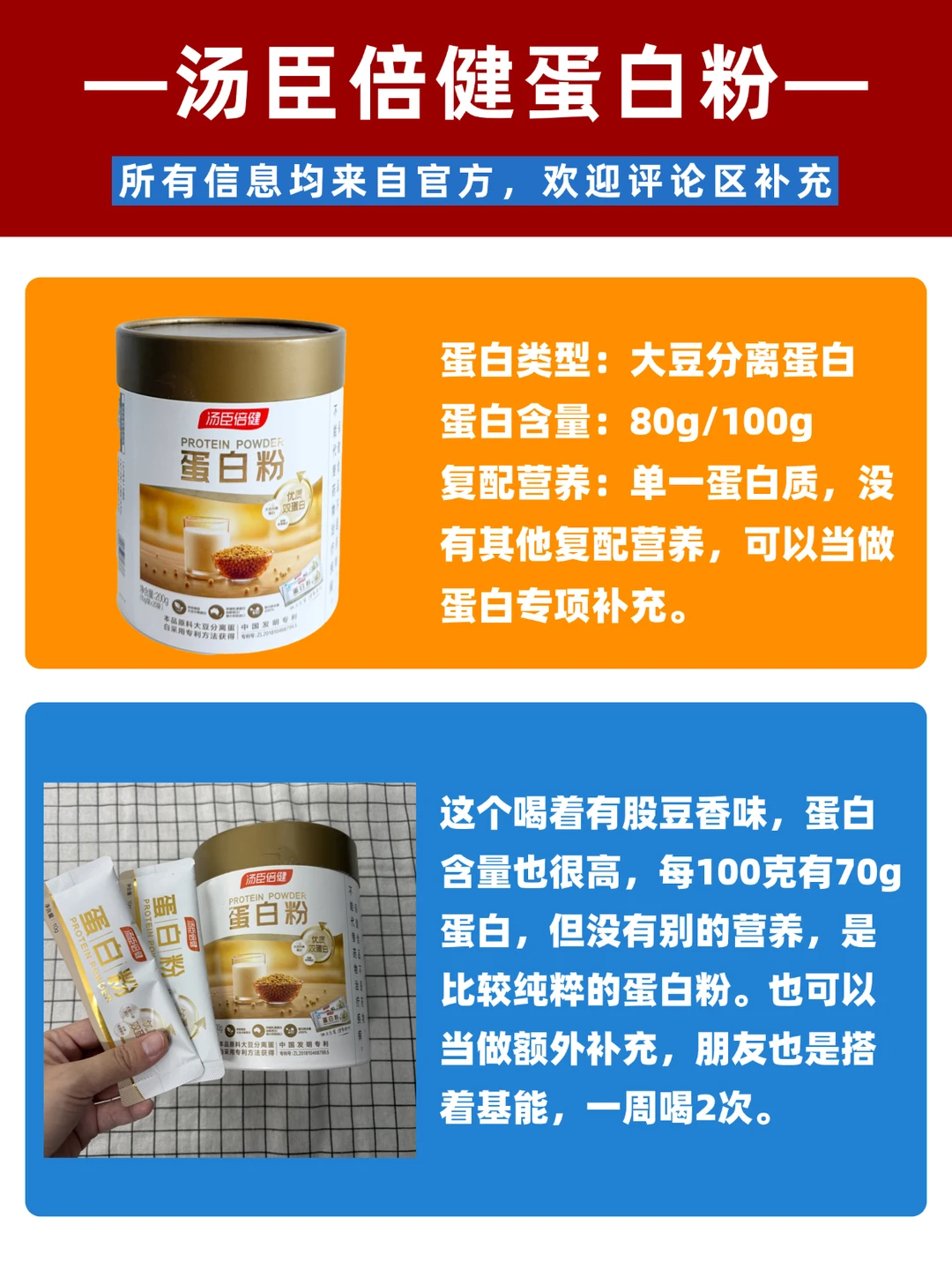 ④汤臣倍健:是豆香味的,蛋白含量也很高,没有别的营养,是比较纯粹的蛋白粉,也可以当做额外补充,朋友也是搭着基能,一周喝2次。