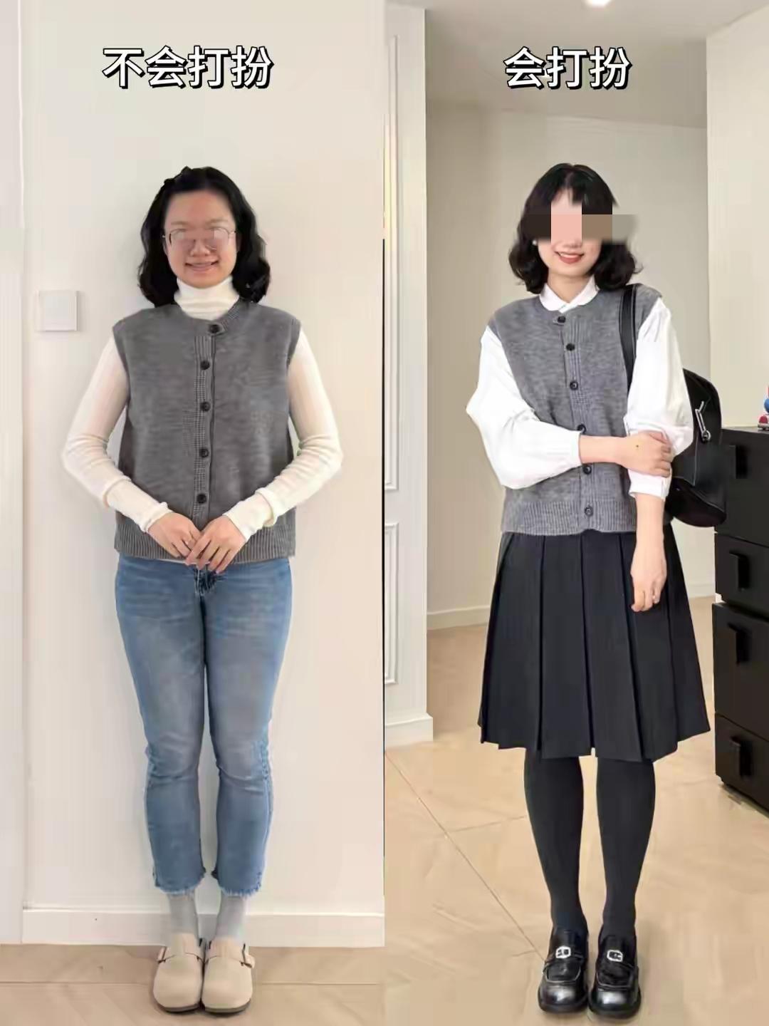 刷到一个对比会打扮和不会打扮的帖子,总结一下,怎么叫会打扮: 1.化妆➕美颜➕🈶刘海: 效果等同换头,刷腻子刷到白了100个度,普女变美女 2.不要戴近视眼镜,挡住你的美貌了 换隐形 3.配饰要齐全: 包包+围巾+首饰(耳环项链…)+各种不同的鞋 4.身材不好就别穿紧身8分裤,显🉐腿粗屁股大 裤腿裤/裙子最大的作用是隐藏曲线(=遮丑) 5.多叠穿几件,显时尚[狗头] 6.把羽绒服敞开穿,大衣扣起来穿扎腰带显瘦[狗头]