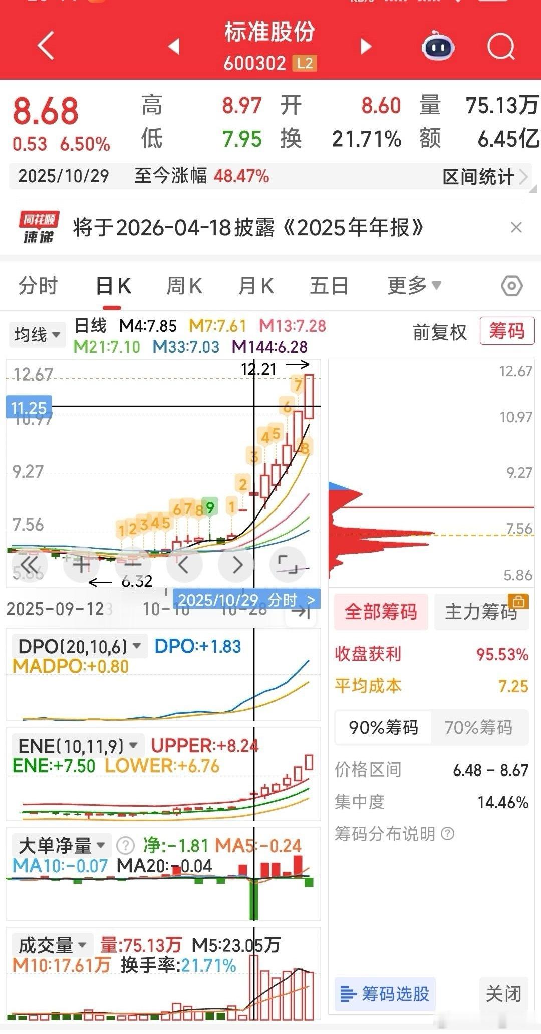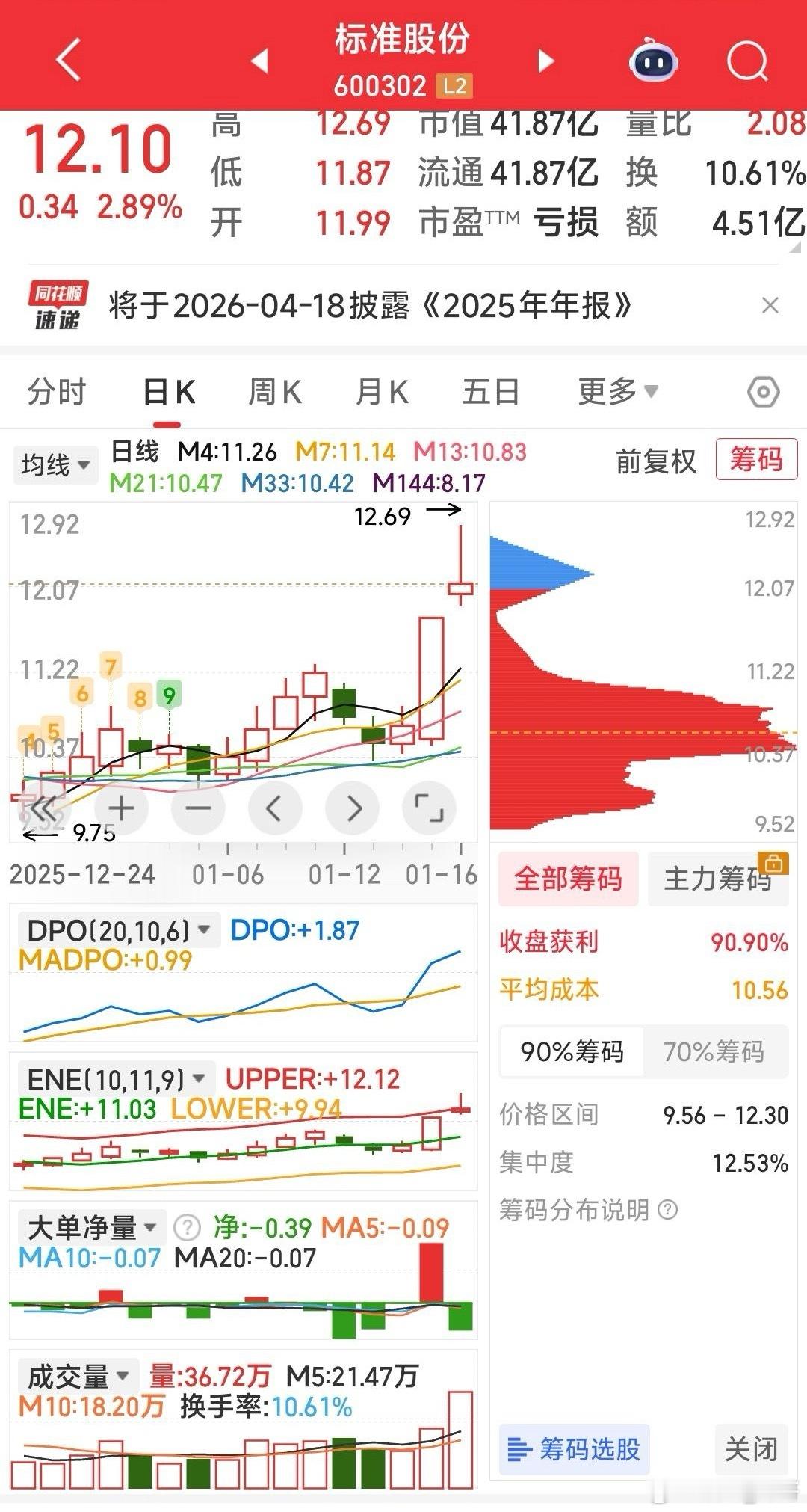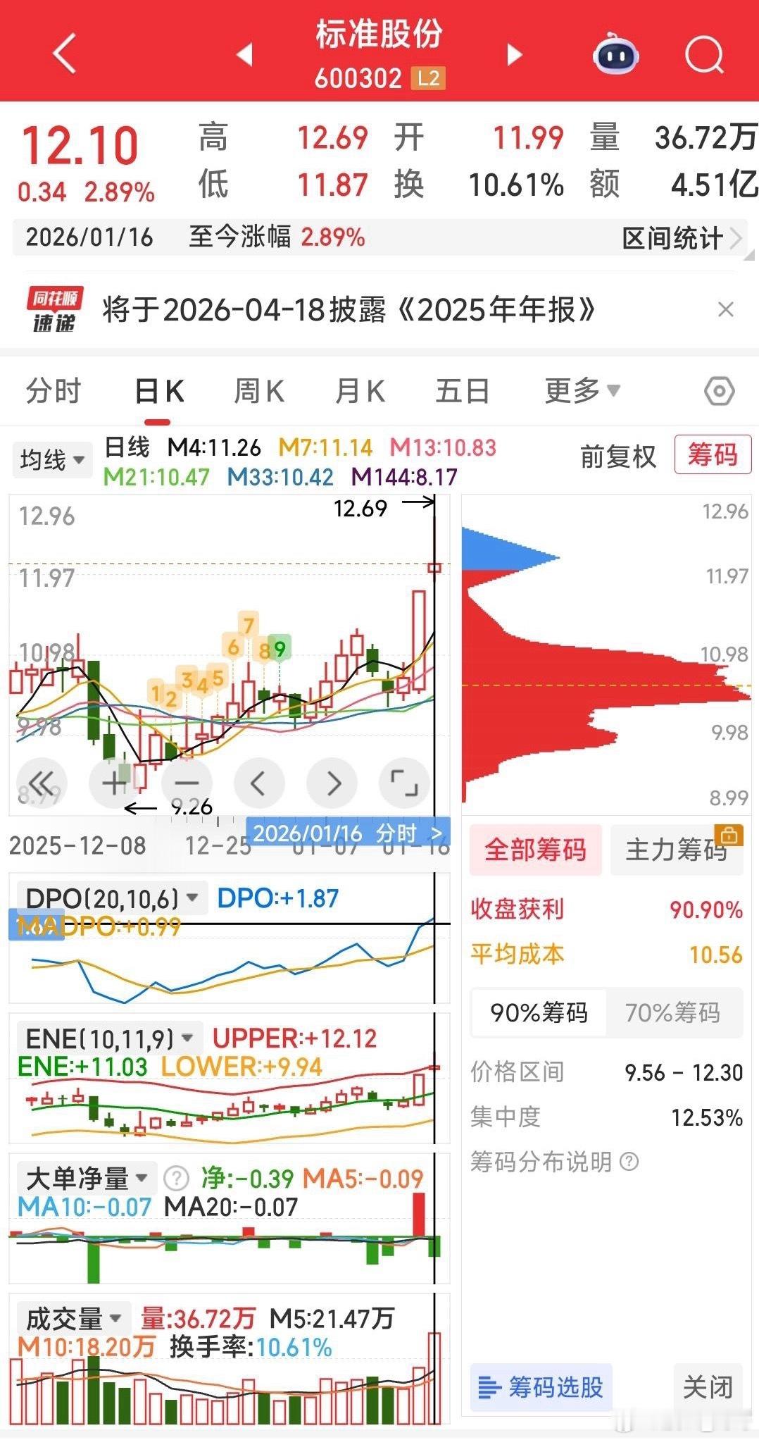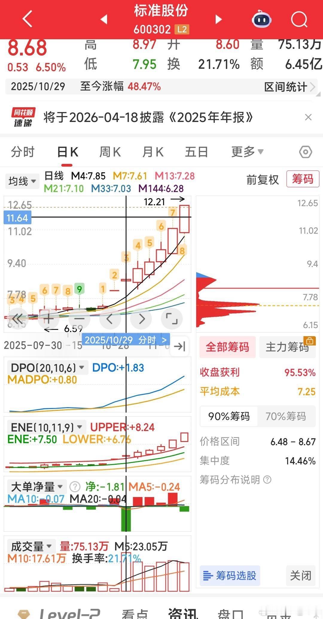 标准股份历史重现请打开标准股份10月29日的K线和今天1月16的K线。再看看对应的技术指标:①筹码分布一样。②成交量一样放量。③主力净流入方式一样。④DPO金叉向上一样。⑤ENE上轨道运行一样。⑥涨停后收带上下影线的上升红十字星。共6个一样。前10月29日后连涨5天,那今天1月16日后会不会连涨5天呢?周粉们,周未想一想吧。开心总比不开心好,那怕只是预想。