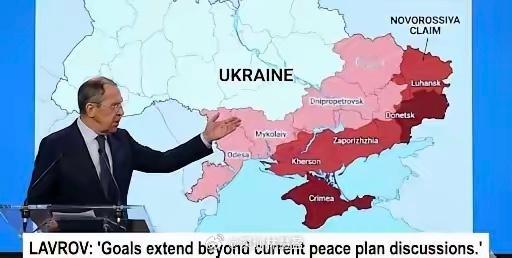 俄罗斯对乌克兰的大胃口:整个“新俄罗斯”!拉夫罗夫在1月14日的讲话中,明确提出俄罗斯在乌克兰的目标,要超出当前和平计划讨论范围。拉夫罗夫说:和平协议不止是顿巴斯,而应该包括所有“新俄罗斯”领土。拉夫罗夫要求未来协议必须解决克里米亚、“新俄罗斯”和顿巴斯地区的问题。“新俄罗斯”的地理范围包含哈尔科夫、第聂伯罗彼得罗夫斯克、尼古拉耶夫和敖德萨州。配图里的地图将哈尔科夫、第聂伯罗彼得罗夫斯克等州直接标注为俄罗斯诉求领土,是对“新俄罗斯”概念的视觉化夸张呈现,再往西就把基辅划进去了。