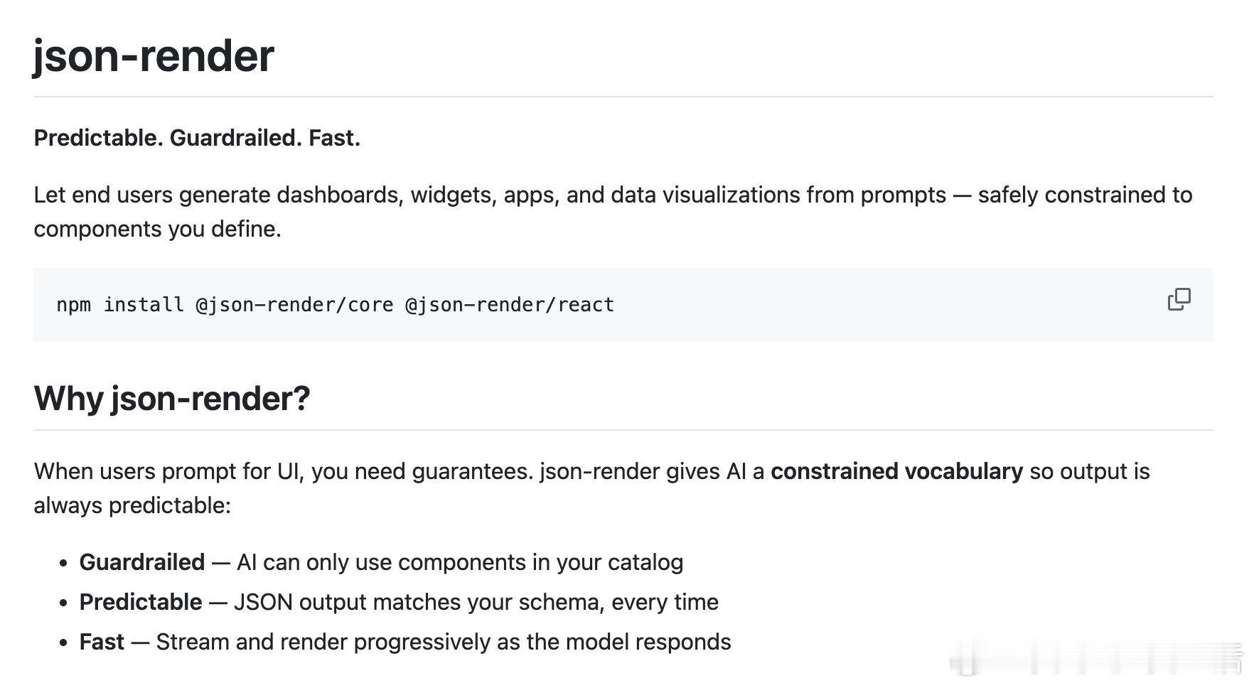 【让AI生成UI,但不让它乱来:json-render的护栏哲学】当我们让AI帮用户生成界面时,最怕的是什么?不是它不够聪明,而是它太"自由"了。Vercel Labs 最近开源了 json-render,一个让AI生成UI变得可控的方案。核心思路很简单:与其让AI直接输出代码,不如让它在你划定的范围内"填空"。这个项目解决的是一个真实痛点:用户用自然语言描述想要的仪表盘、小组件或数据可视化,AI负责生成,但输出必须可预测、可信任。它的设计哲学可以用三个词概括:可预测——AI输出的JSON严格匹配你定义的schema,不会有意外结构有护栏——AI只能使用你目录里的组件,想用没定义的?不存在的快速——支持流式渲染,模型边生成边显示工作流程也很清晰:第一步,你定义一个"组件目录",告诉AI它能用什么。比如Card、Metric、Button,每个组件有什么属性、接受什么参数,用Zod做类型约束。第二步,注册这些组件的实际渲染逻辑。JSON里的声明式描述,对应到你的React组件。第三步,用户输入提示词,AI生成符合规范的JSON树,渲染器把它变成真实界面。这里有个设计细节值得注意:动作(Action)的处理方式。AI只负责声明"意图",比如"导出报告"或"刷新数据",具体怎么执行由你的代码决定。这是一种很聪明的责任划分——AI管"说什么",你管"怎么做"。它还内置了一些实用功能:条件可见性(根据数据或登录状态显示隐藏组件)、带确认对话框的动作、表单验证等。这些都是实际业务场景里绑定会用到的东西。从更大的视角看,json-render代表了一种AI应用的设计模式:不是让AI无限制地生成任意内容,而是给它一个精心设计的"词汇表"。在这个词汇表内,AI可以自由组合;超出这个范围,门都没有。这种约束不是限制,而是信任的基础。用户敢用AI生成的界面,是因为知道它不会突然冒出一个奇怪的组件或执行一个未授权的操作。对于想在产品里集成AI生成UI能力的团队来说,这是一个值得研究的参考实现。github.com/vercel-labs/json-render