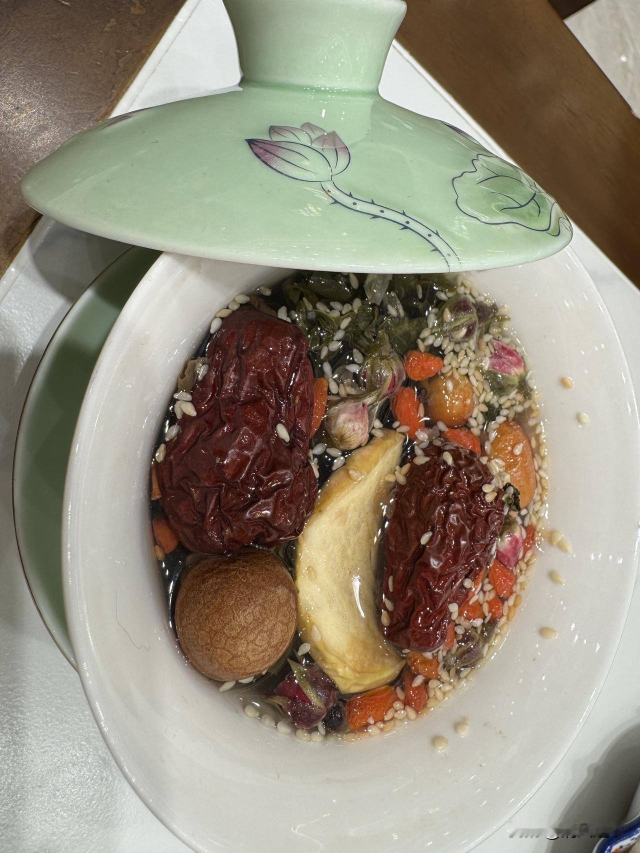 这碗八宝茶 喝的是烟火气 暖的是打工人的心 刚坐下,服务员就端来这碗盖碗八宝茶,掀开盖子的瞬间,红枣、桂圆、枸杞、芝麻干花混在一起的香气就漫开了。 冬天里手凉脚凉的毛病,就靠这碗热茶续命。茶汤甜而不腻,喝一口从喉咙暖到胃里,感觉一天的疲惫都散了大半。 现在才明白,老祖宗爱喝的八宝茶,哪是为了喝茶,是为了在忙碌的日子里,给自己留一份甜暖的仪式感。生活的苦,有时候真的不如一碗热茶来得实在。