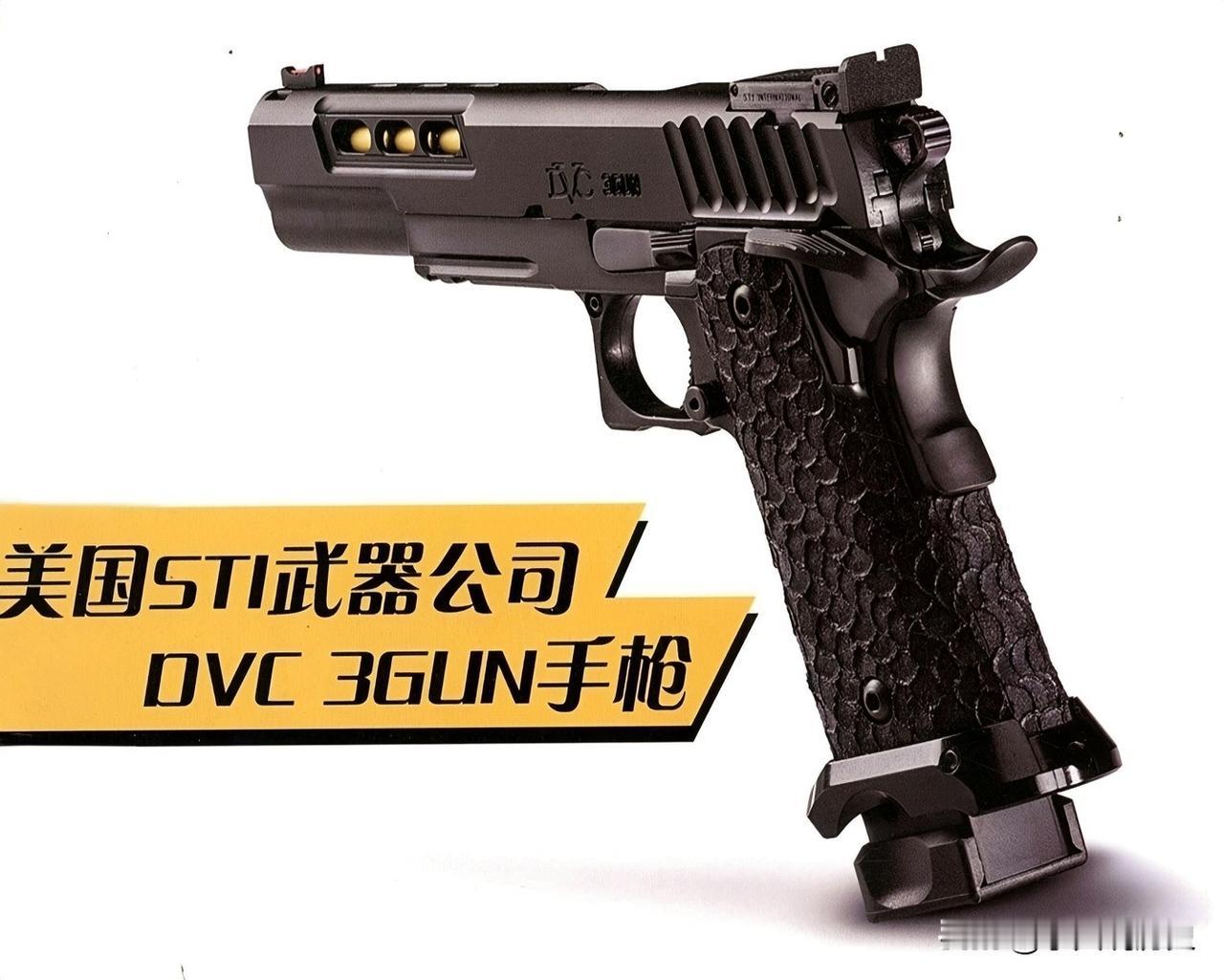 美国STI武器公司DVC 3GUN手枪 STI武器公司出的2011系列手枪,最早是从定制款M1911手枪改过来的,一路琢磨改进,现在都有20个不同款式了。 2016年推出的DVC 3GUN,就是专门用来参加三枪比赛的型号。 这枪的套筒座是合成材料做的,里面镶着钢架子,握把上有像鱼鳞似的纹路,握着手不打滑。 套筒用不锈钢做的,两边开了槽能减轻重量,顶部前面安了个红色光纤准星,后面的缺口照门能左右调位置。 枪管长137毫米,也是不锈钢的,枪膛镀了铬,表面有一层氮化钛涂层,颜色是金黄色的。弹匣底座挺大,比握把底部要突出一些,能装21发子弹,容量真不小。