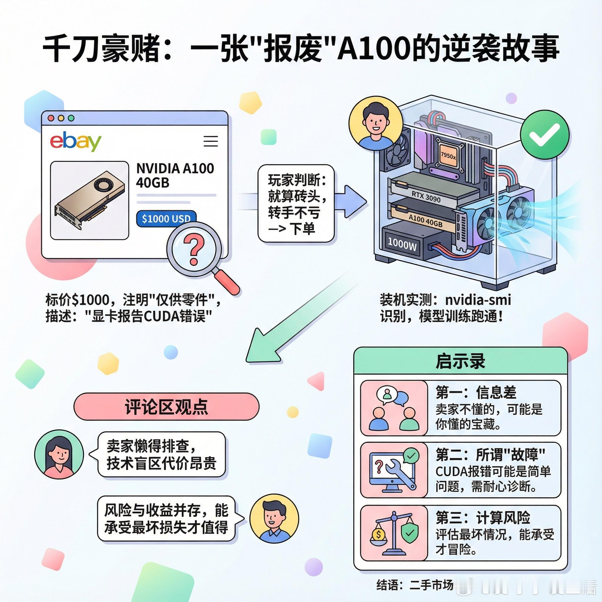 【千刀豪赌:一张“报废”A100的逆袭故事】有时候,别人眼中的废品,恰恰是你的宝藏。Reddit上一位玩家分享了他的“捡漏”经历:在eBay上看到一张A100 40GB显卡,标价1000美元,卖家注明“仅供零件使用”,描述只写了一句话——“显卡报告CUDA错误”。换作大多数人,看到这几个字早就划走了。但他做了个判断:就算真是砖头,按这个价格转手也不会亏。于是下单。结果呢?装机后第一次开机,nvidia-smi直接识别,模型训练立刻跑通。完美运行。一张数据中心级显卡,市价动辄数千美元,就这样以十分之一的价格到手。评论区有人一针见血:前任卖家大概是遇到问题懒得排查,直接当废品卖了。技术盲区的代价,有时候真的很昂贵。这位玩家的配置也值得一看:7950x处理器加3090显卡,本来就是一台不错的本地AI工作站。现在A100加入后,他用3D打印的导风罩配合两个40mm风扇解决散热,功耗墙分别设在3090的280W和A100的250W,一块千瓦电源稳稳撑住。有人问他怕不怕翻车。他说,风险和收益要放在一起看。这张卡就算真坏了,按零件价出掉也不亏本。但如果能用,那就是捡到宝。这个故事的启示其实很简单:第一,信息差永远存在。卖家不懂的东西,可能正是你懂的。第二,所谓“故障”,很多时候只是没人愿意花时间去诊断。一个CUDA报错,可能只是驱动问题、系统问题,甚至只是需要重启一下。第三,计算好最坏情况的损失,再决定要不要冒险。能承受的风险,才是值得一试的风险。当然,这种操作不建议盲目模仿。但对于有技术底子、愿意折腾的人来说,二手市场确实藏着不少被低估的机会。www.reddit.com/r/LocalLLaMA/comments/1qe0cxc/latest_upgradea100_40_gb