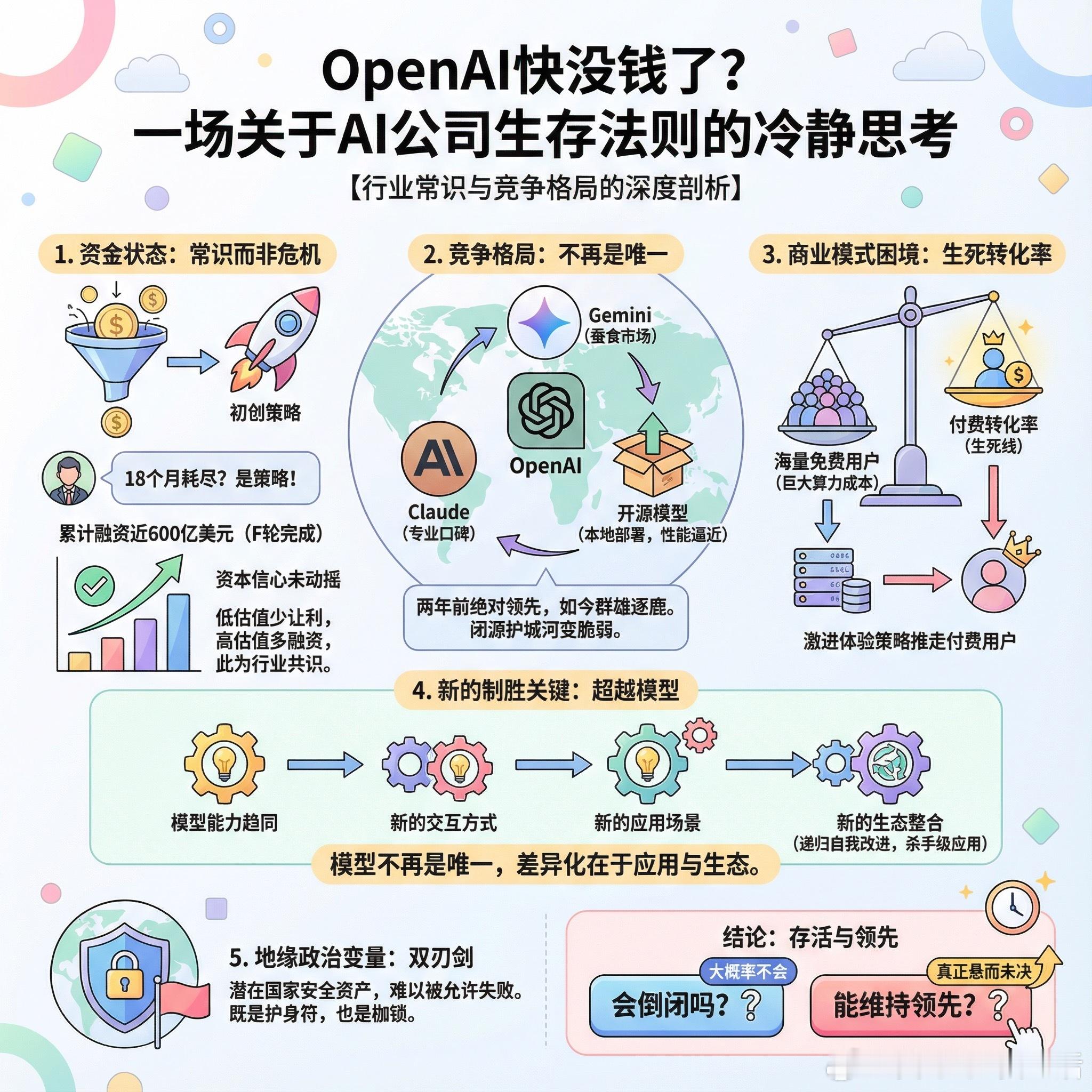 【OpenAI快没钱了?一场关于AI公司生存法则的冷静思考】一篇“金融专家称OpenAI即将耗尽资金”的报道在社区引发热议。但在恐慌之前,我们或许需要更冷静地看待这件事。先说一个行业常识:几乎所有科技初创公司都处于“18个月内耗尽资金”的状态。这不是危机,而是一种策略。为什么要在公司估值较低时出让更多股份?聪明的做法是融够下一阶段的钱,等估值上涨后再融下一轮。OpenAI已完成F轮融资,累计融资近600亿美元,资本市场对它的信心从未真正动摇。但这不意味着OpenAI高枕无忧。真正值得关注的问题是:两年前的绝对领先者,如今面临的竞争格局已截然不同。Gemini在蚕食市场,Claude在专业领域建立口碑,开源模型正在崛起。当一个80%性能的开源模型可以本地部署时,闭源模型的护城河就变得脆弱了。更深层的困境在于商业模式。海量免费用户意味着巨大的算力成本,而付费转化率才是生死线。有人指出,OpenAI在用户体验上的一些激进策略正在把付费用户推向竞争对手。有一个观点值得深思:在这个赛道上,模型本身已经不是制胜关键。当头部玩家的模型能力趋于接近,真正的差异化来自于新的交互方式、新的应用场景、新的生态整合。谁能率先实现递归自我改进,谁能找到模型之外的杀手级应用,谁才能真正突围。还有一个不可忽视的变量:地缘政治。作为潜在的国家安全资产,OpenAI很难被允许失败。这既是护身符,也是枷锁。所以,OpenAI会倒闭吗?大概率不会。但它能否维持领先地位?这才是真正悬而未决的问题。reddit.com/r/OpenAI/comments/1qe7uy5/financial_expert_says_openai_is_on_the_verge_of