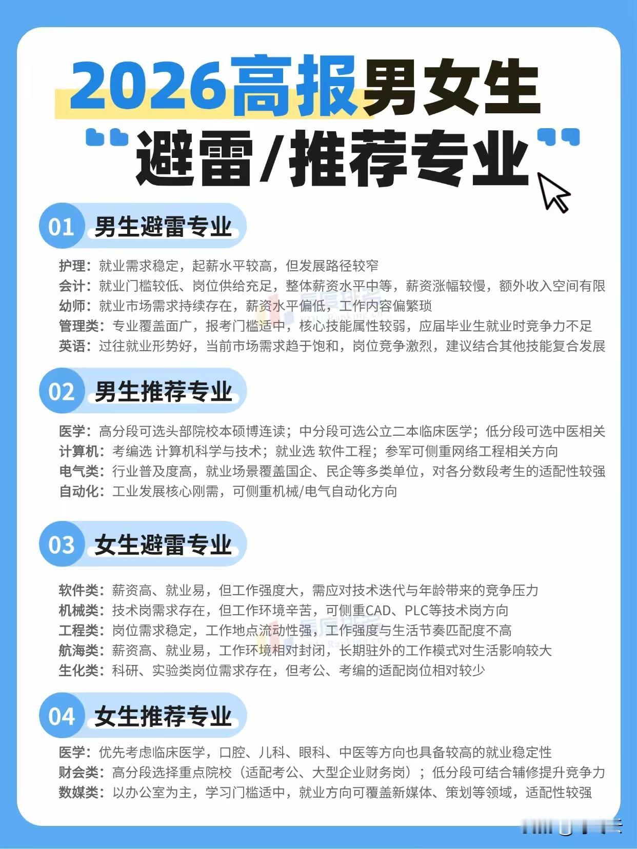 避雷!从职业规划角度来看高考志愿专业推荐!就业竞争激烈,职业选择有差异!速速围观揭秘详细内容![点亮平安灯][点亮平安灯] ♂男生避雷专业:护理专业、护理专业、管理专业等等;推荐专业:计算机、电气类专业、自动化专业等等; ♀女生避雷专业:软件工程、机械工程、航海类、工程类等等;详见附件图介绍。 什么专业容易进央企国企? @叮咚云 将优先为粉丝职业规划指导,1对1咨询是付费服务,为你定制最适合的就业择业方案!欢迎留言交流讨论。[来看我][来看我] 免责声明:图片来自网络,仅供参考! 央国企求职