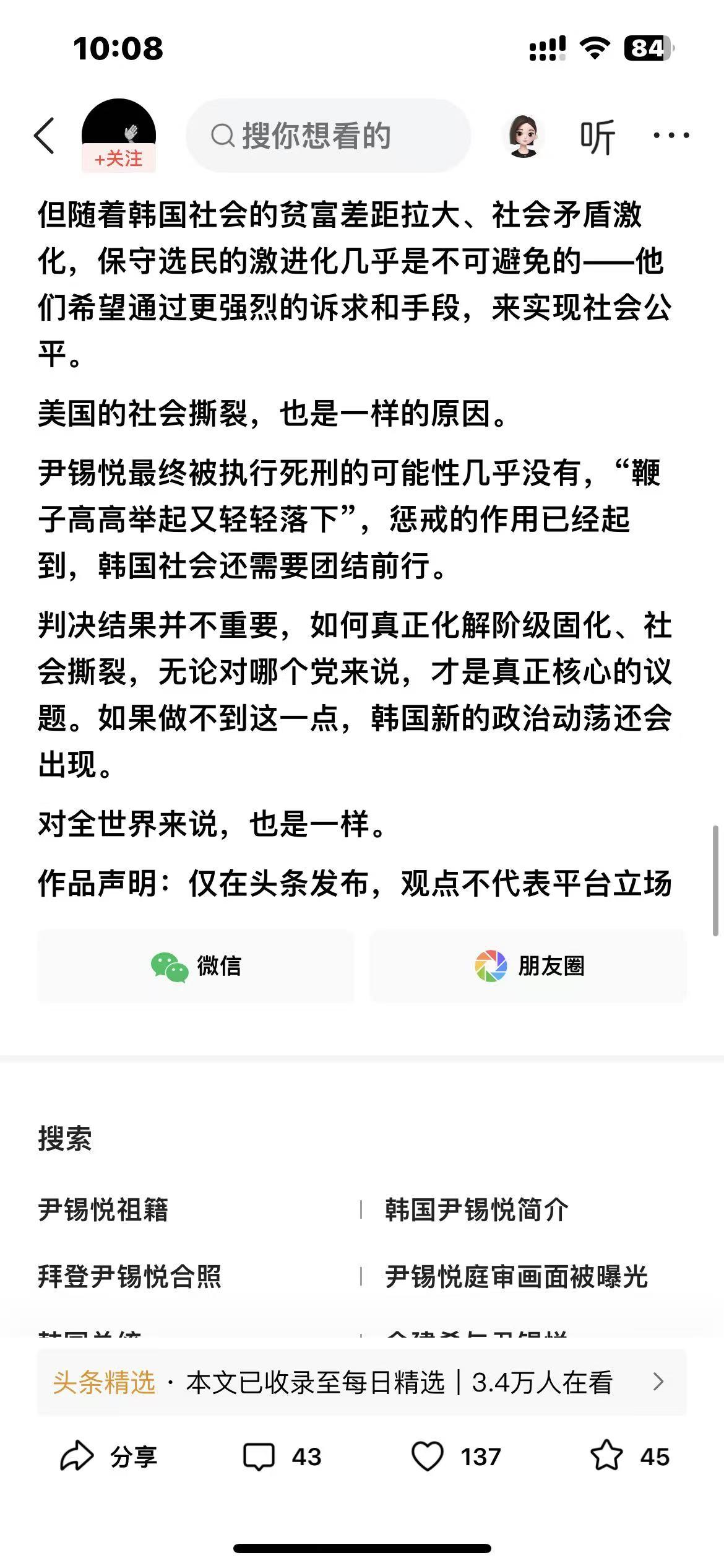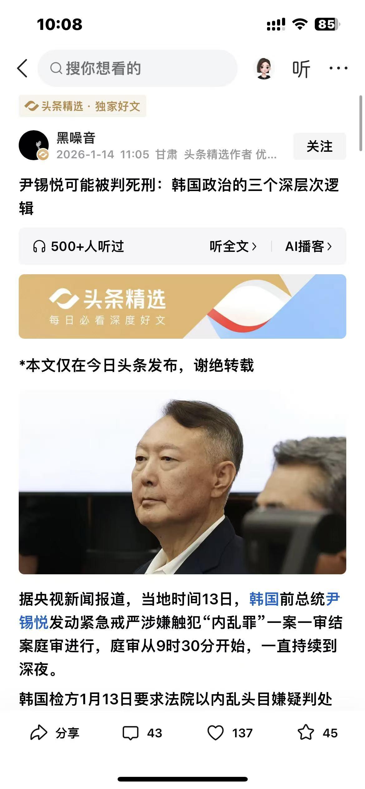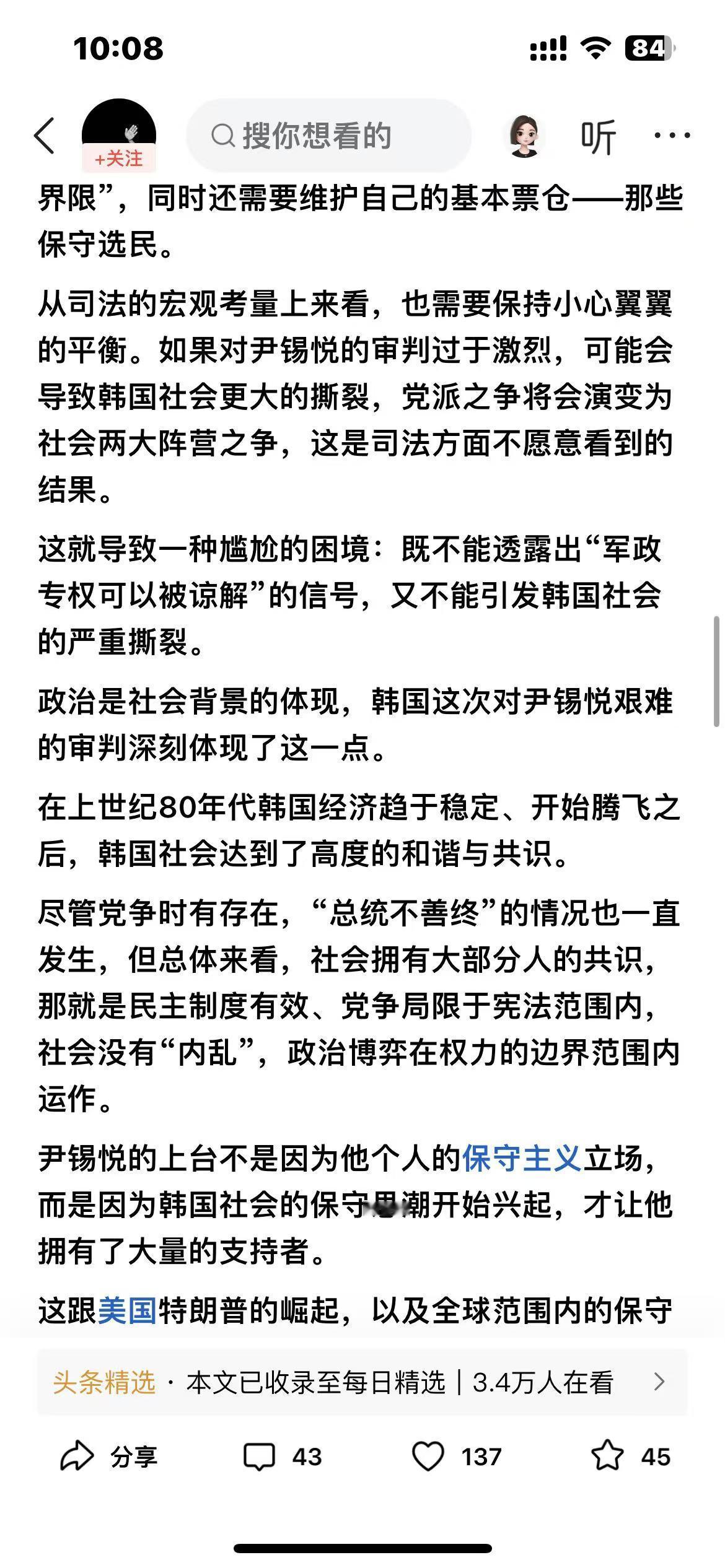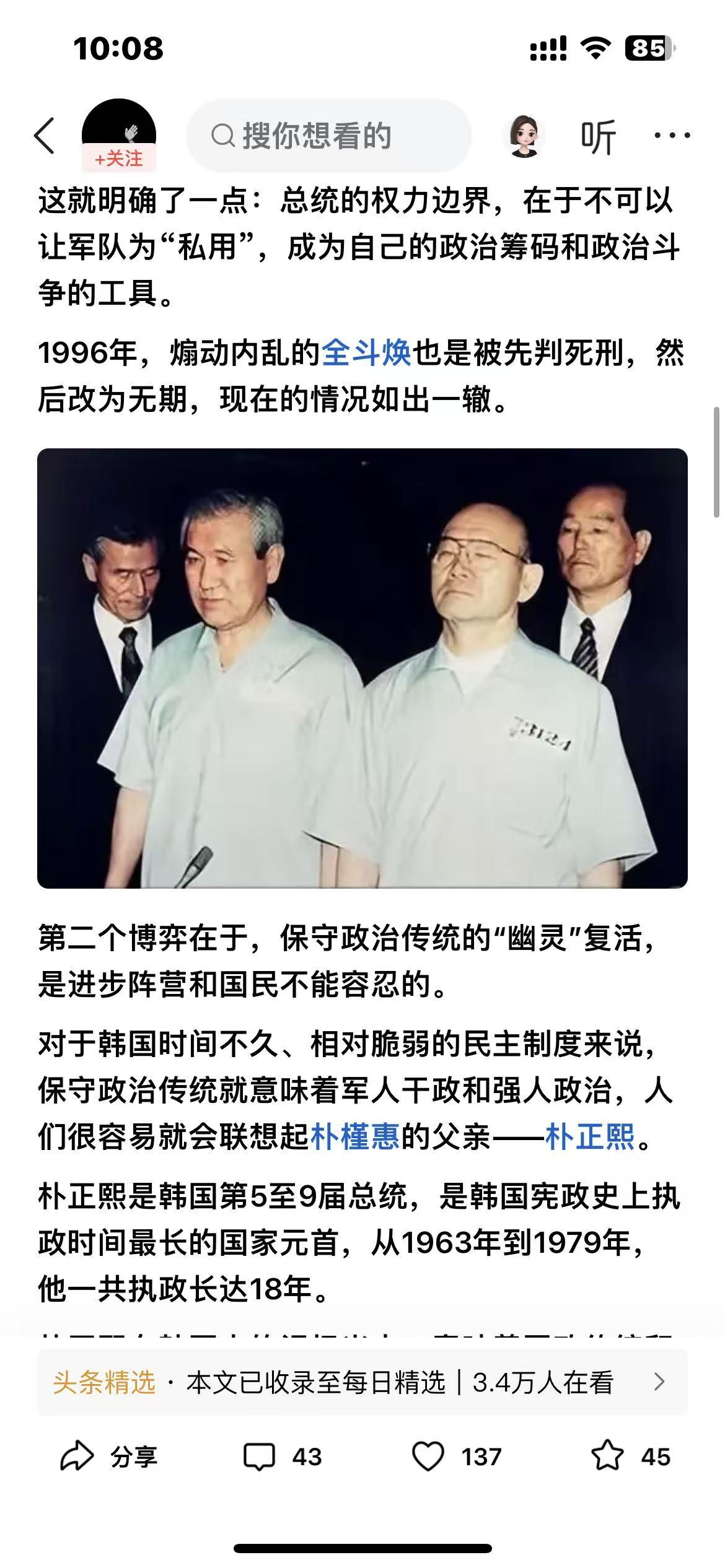 谁能想到,尹锡悦被求判死刑的背后,竟藏着韩国政治的 “三重密码”?读这篇文章时,像在拆一个复杂的 “政治盲盒”,每解开一层,就冒出新的疑问。 第一层密码是 “权力红线”。检方求判死刑不是要真执行,而是给总统权力 “划边界”—— 军队不能当私用工具。全斗焕的先例摆在那,死刑诉求更像 “制度警告”。可问题来了:韩国总统权力集中是出了名的,这次划的线能管多久?下任总统会不会换个方式越界? 第二层密码是 “历史阴影”。尹锡悦为啥触发众怒?因为他的行为让韩国人想起了朴正熙的军政府时代,那种 “强人政治” 的恐惧刻在骨子里,可为啥几十年后,保守思潮还能卷土重来?第三层密码是 “社会平衡”。韩国保守派选民还在支持尹锡悦,审判太重怕引发动荡,太轻又怕没震慑力,这种 “两难” 会不会让审判变成 “走过场”? 而且文中提到全球保守思潮回归,特朗普和尹锡悦的行为很像,这是不是说明单极世界秩序在松动?尹锡悦案会不会成为韩国政治改革的契机?有没有了解韩国政治的朋友,来聊聊这些 “密码” 背后,到底藏着怎样的未来?