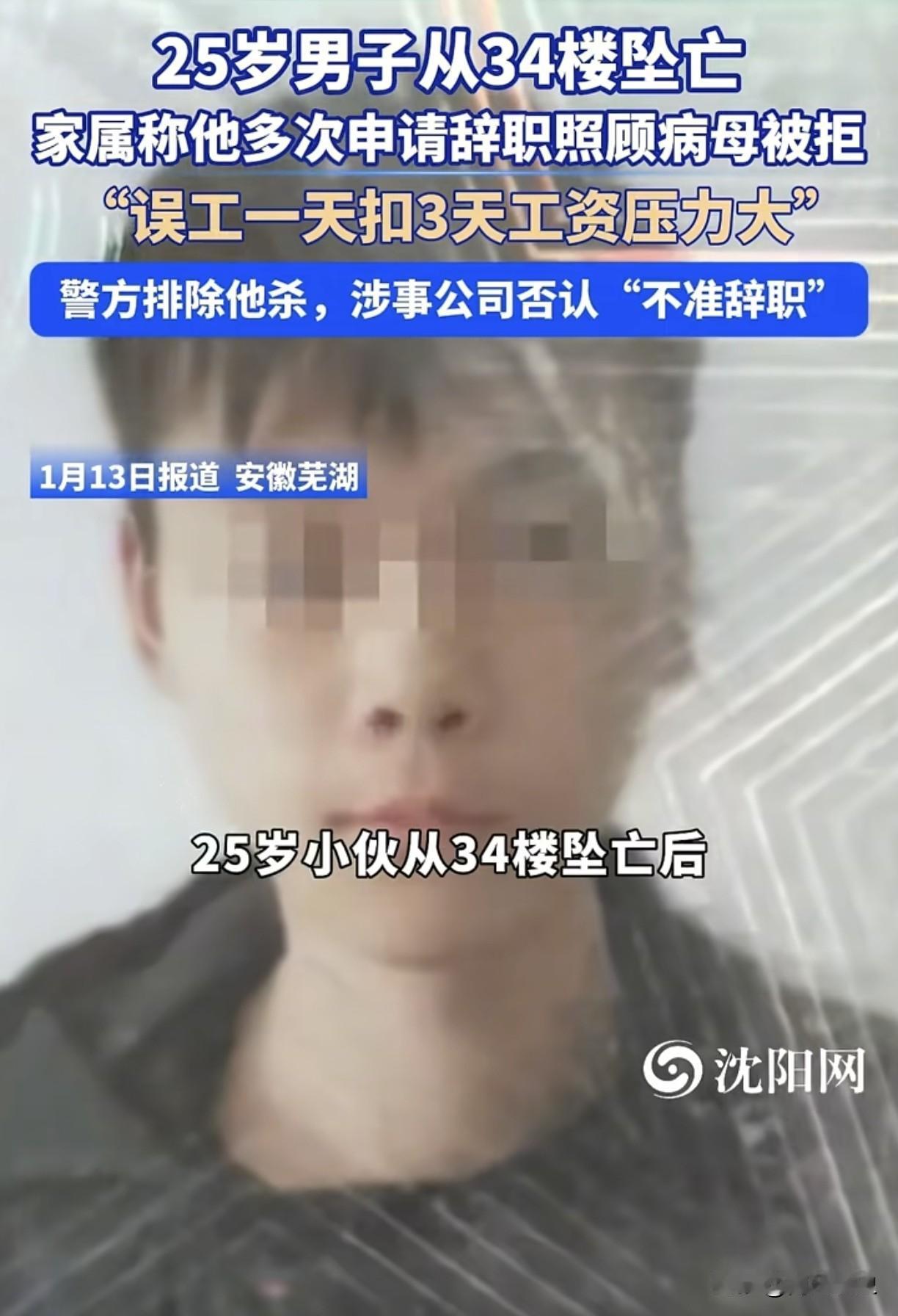 痛心!安徽芜湖,25岁小伙从34楼坠楼身亡。只因要辞职回家照顾生病的母亲,但申请多次公司却不批准,而且误工一天要罚三天工资。所在公司说:跟劳务中介签的合同;劳务中介说:没有不批!网友说:劳务外包得好好管管了! 2025年12月27日深夜,芜湖的气温降到了零度以下。 小张站在34楼的窗口,手机里还存着父亲催他回家的微信。那条信息停留在三天前,他一直没敢回复。 这个25岁的年轻人算过太多次了。回家照顾瘫痪母亲就得辞职,可一旦辞职,被扣押的工资就拿不回来,母亲的医药费也就没了着落。怎么算都是死胡同。 午夜12点,他关掉手机,结束了这场无解的方程式。 母亲是在两个月前倒下的,脑梗让她右半边身子完全失去知觉。 老家的父亲年纪大了,一个人伺候不过来,电话里的声音一次比一次急。 小张不是没试过正常离职。 他写了申请交给班长,班长转给人事科,然后就没了下文。一周过去,他又去问,得到的答复是"流程还在走"。 等不起的他想过直接走人。但厂里早就设好了陷阱——旷工按三倍扣工资,还要扣掉全勤奖。他在这里干了快两年,被压着的薪水加起来超过一万块。 这笔钱对他来说不是小数目。母亲躺在医院的账单每天都在增长,家里已经掏空了所有积蓄。他不敢丢掉这些血汗钱,却也等不来辞职的批复。 问题卡在一个巧妙的设计上。 他的合同签在劳务中介那里,干活却在安瑞光电的车间。想辞职得找中介,中介说要跟工厂商量,工厂说人是中介的不归我管。 这种三方游戏玩了十几年了。 企业用这招把用工风险甩得干干净净,中介靠抽成过日子谁都不敢得罪,夹在中间的工人成了皮球。 法律上其实很明确,提前三十天通知就能走,根本不需要谁签字画押。 那条旷工罚款的规定更是站不住脚。但在工业区的铁门里面,厂规有时候比法律管用得多。 小张的家人后来从河南赶来,想向工厂讨个公道。 在门口站了十几天,连大门都没进去。 工友们私下证实辞职确实受阻,但无人敢公开出面作证。 劳务公司这时候跳出来否认一切。 说根本不存在不批辞职的事,还说跟家属谈过只是没谈拢。 安瑞光电的态度很直接,工作人员只说 “不清楚这事”,接着便匆匆挂断了电话。 每个人都在心里打着自己的小算盘。企业要保产量所以卡人,中介要保客户所以和稀泥,谁都不愿意承认这套机制本身就是吃人的。 小张大概也想过硬闯。 不要那一万多块钱,直接买票回家。 但他不敢赌,母亲等着钱买药,父亲的积蓄早就见了底。他要是两手空空回去,这个家就彻底塌了。 这场悲剧的核心,是一整套把工人当耗材的体系。 当企业通过层层转包把成本压到极致的时候,被压碎的不只是利润空间,还有人的生存底线。 那个寒冷的夜晚,小张选择了最惨烈的方式,彻底走出了这个无解的困局。 他瘫痪在床的母亲,此刻还在老家的病榻上,手里紧紧攥着儿子的照片。她不会明白什么叫劳务派遣,也不懂为什么儿子说快回来了却一直没回来。 现在监管部门介入调查了。 但关键不是看谁的声明写得滴水不漏,而是能不能把这个把人逼死的机制彻底拆掉。 别让"流程没走完"继续成为挡箭牌,别让那些黑规矩继续在暗处收割。 一条年轻的生命已经没了,这笔账总该有人算清楚。 信息来源:沈阳网