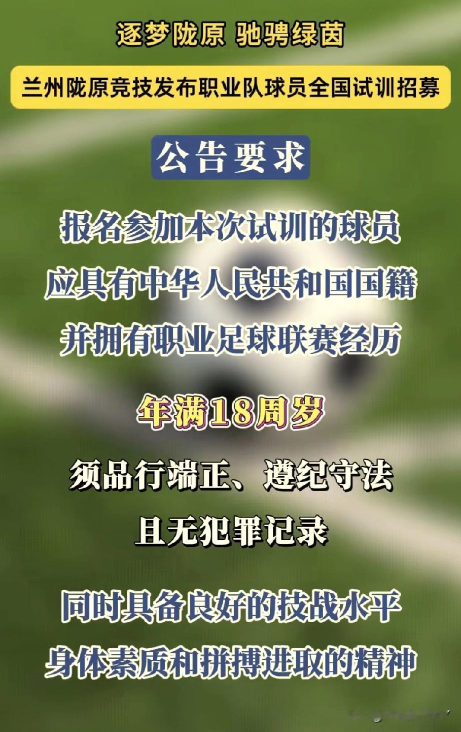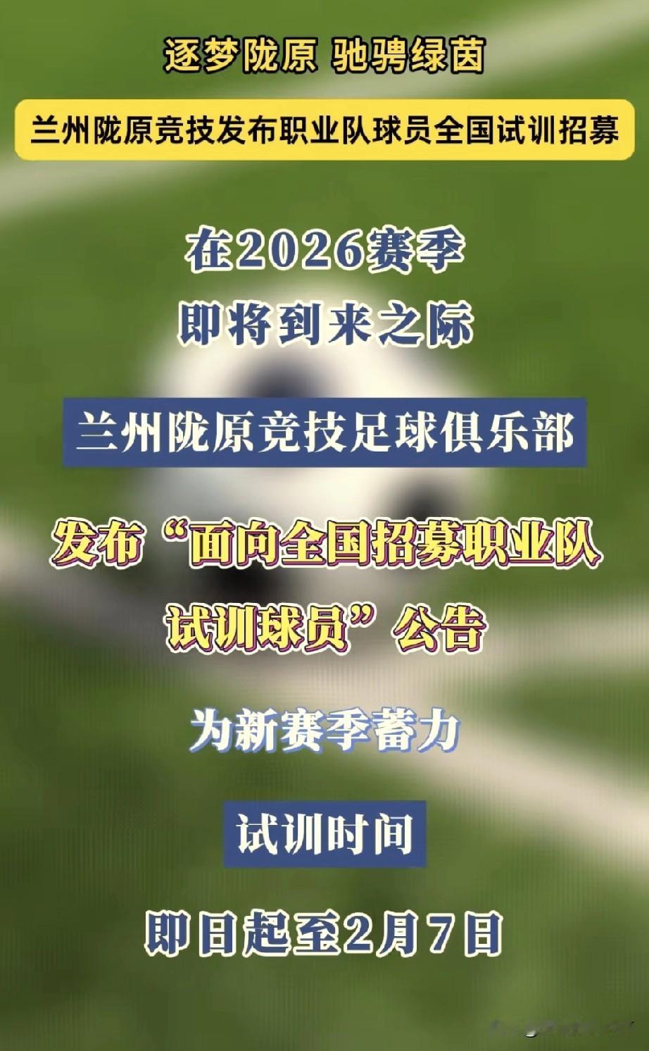 在云南昆明基训的乙级球队甘肃兰州陇原竞技俱乐部,发布了今年球员试训和招募。