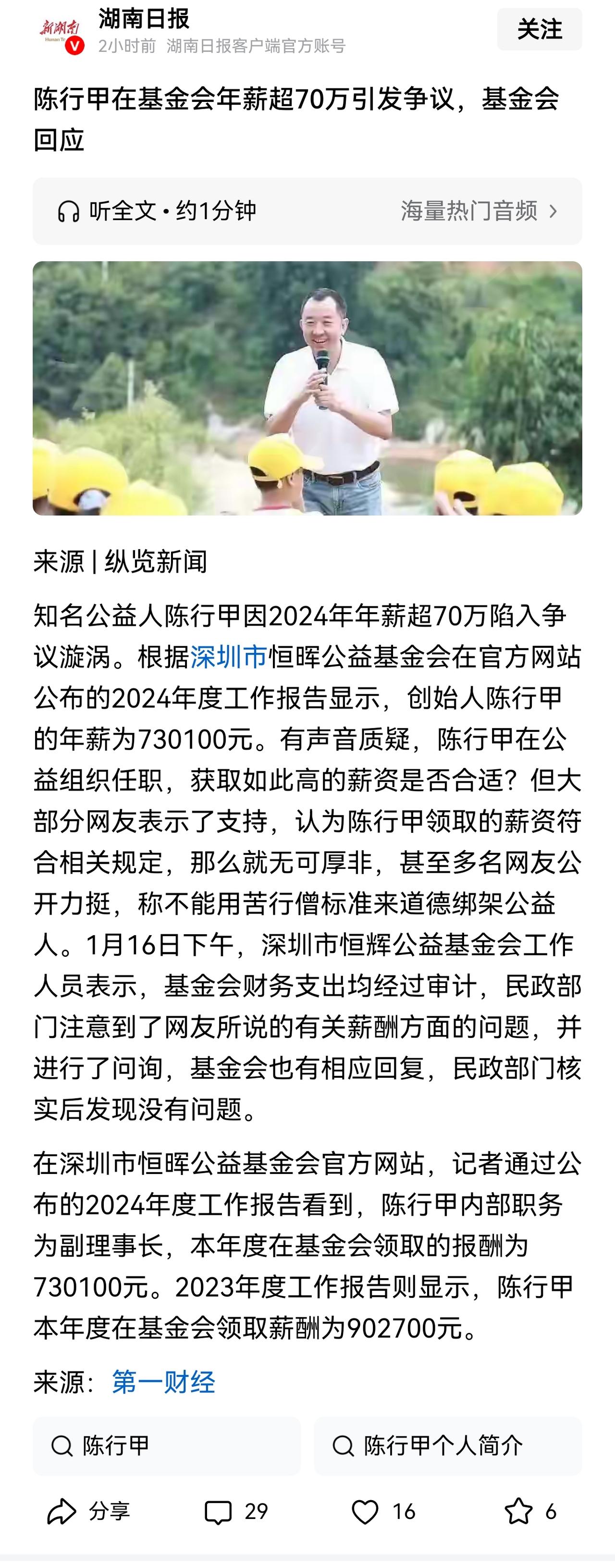 公益要做好,必须有高素质的专业人才,全身心地投入。这个薪酬对陈行甲来说,很正常。只要符合规定、公开透明,也就不要怕质疑。
