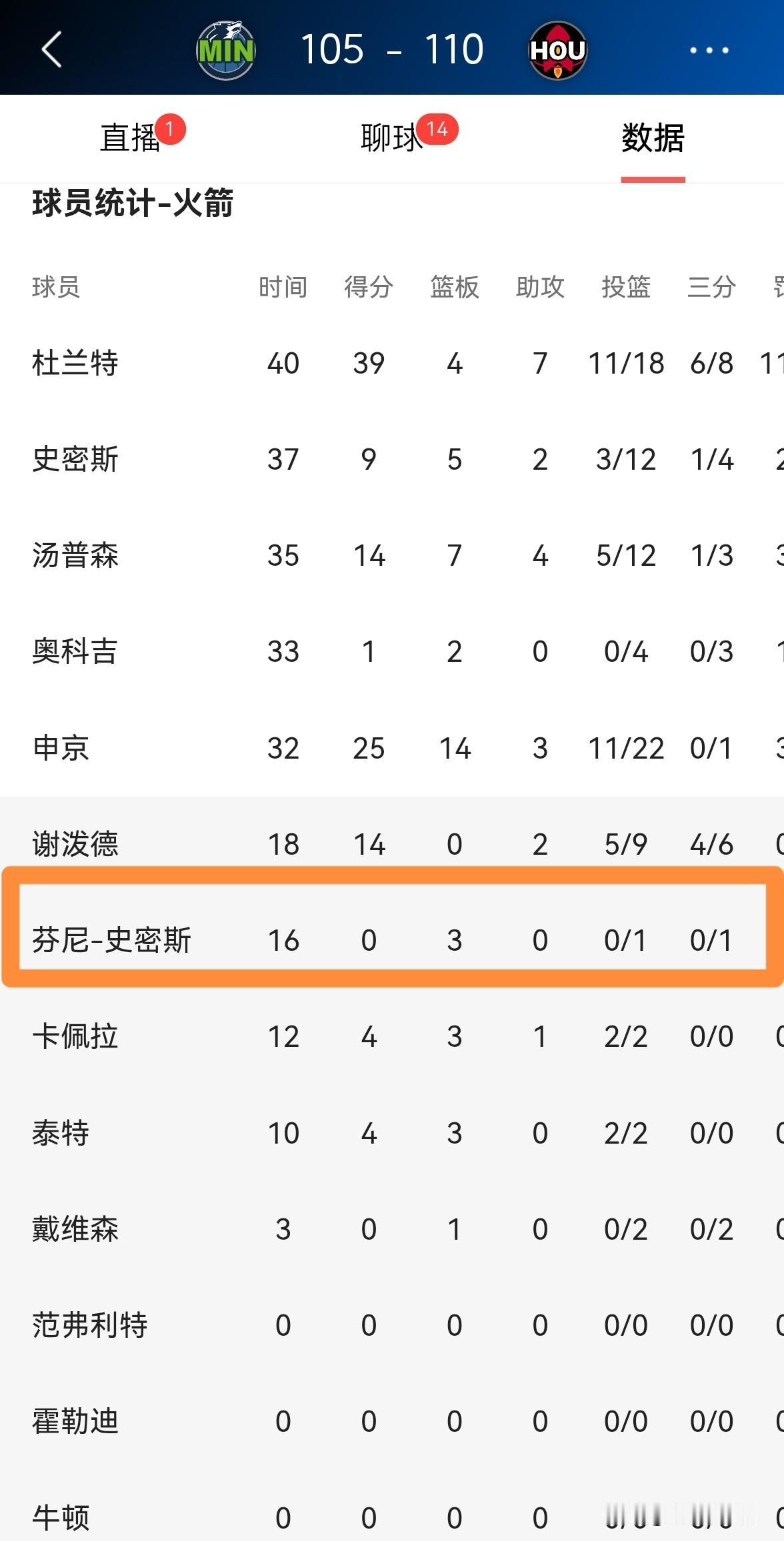 火箭悍将芬尼-史密斯真是给机会不中用啊!在今天火箭主场以110:105击败森林狼