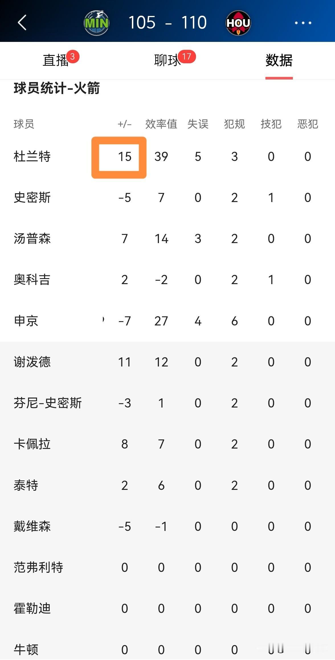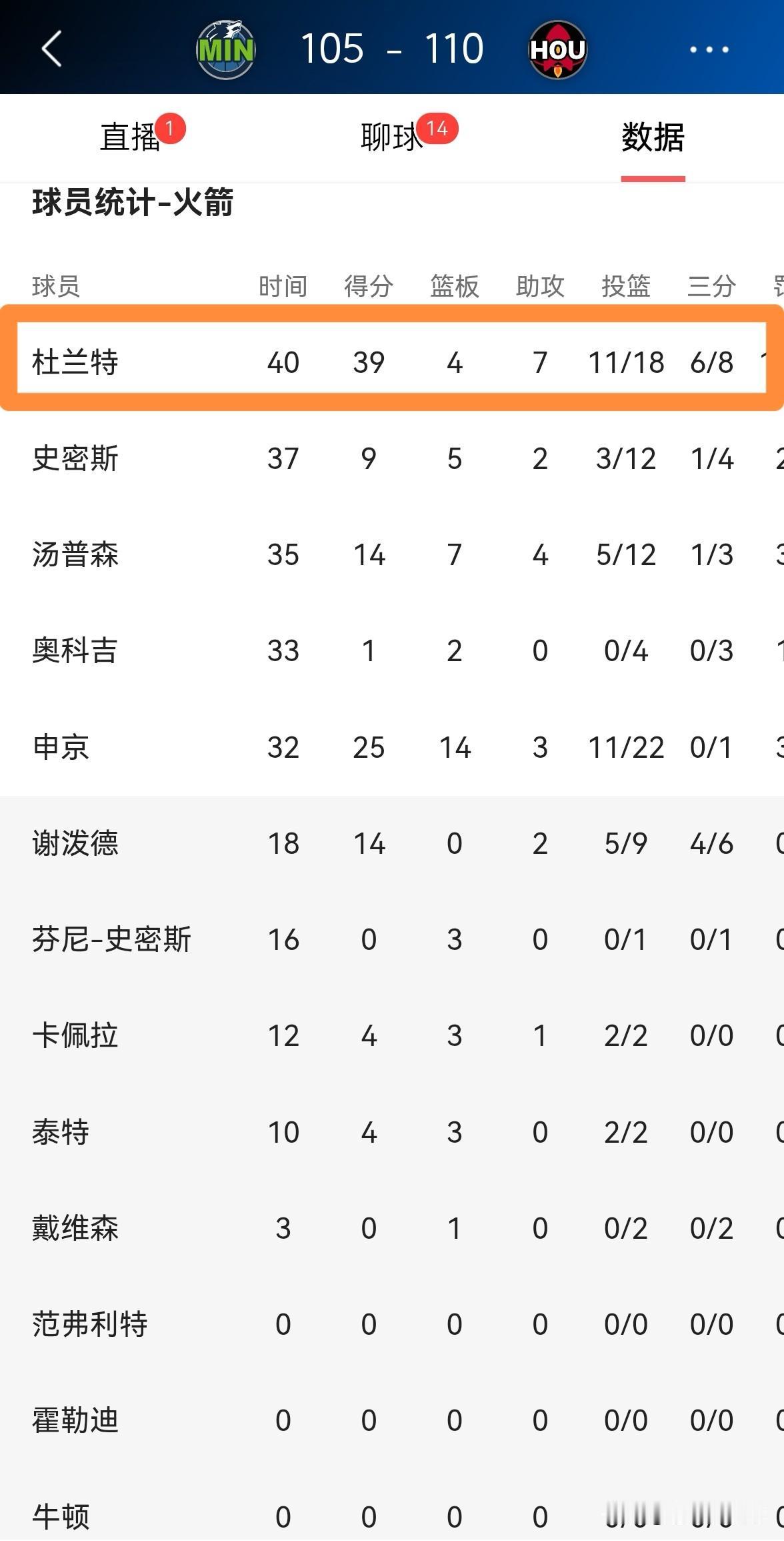 恭喜火箭巨星杜兰特怒砍赛季新高的39分!在今天火箭主场以110:105力克森林狼的比赛中,手感滚烫的杜兰特爆砍赛季新高的39分,成为了球队获胜的最大功臣。 全场比赛下来,杜兰特首发出战40分钟,投篮18中11,其中三分球8中6、罚球14中11爆砍39分,还有4篮板7助攻2抢断1盖帽,他的场上正负值为全队最高的+15,唯一美中不足的是本场比赛杜兰特出现了5次失误。