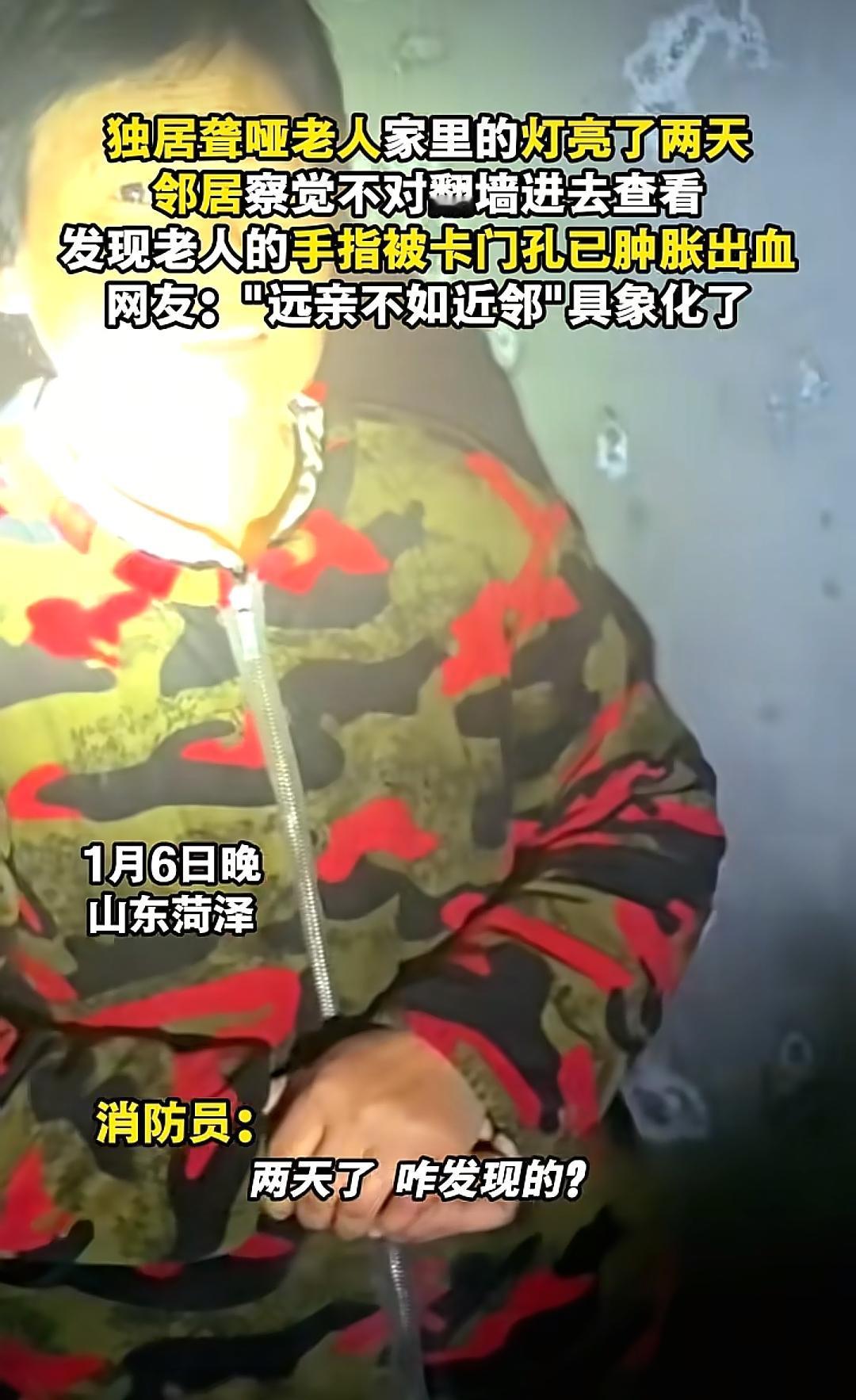 独居聋哑老人家里的灯亮了两天,邻居察觉不对翻墙进去查看,发现老人的手指被卡门孔已肿胀出血,网友:"远亲不如近邻"具象化了