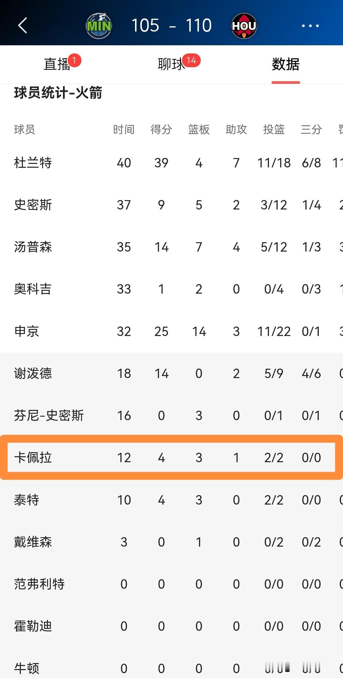 我必须要好好的夸夸火箭中锋卡佩拉!今天火箭在主场以110:105力克森林狼,本场比赛由于亚当斯的缺阵,因此卡佩拉获得了一定的出场时间,他在替补出战的12分钟里,投篮2中2得到4分,还有3篮板1助攻1抢断,他的场上正负值为+8。 对于卡佩拉来说,他必须抓住亚当斯缺阵的机会从而证明自己,老实说,本场比赛卡佩拉完全把握住了这样的机会,他在攻防两端都为球队提供了不小的帮助。