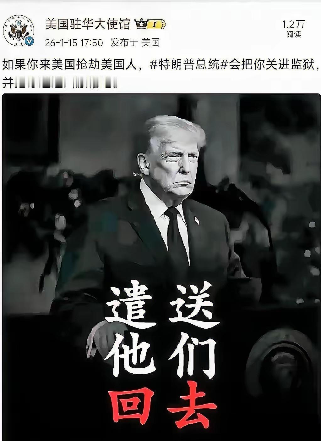 美国驻华大使馆,这话作何解?要是你去美国抢劫美国人,特朗普会把你关进监狱,还将你遣返至原籍地?这是针对牢A下达的何种指令吗?
