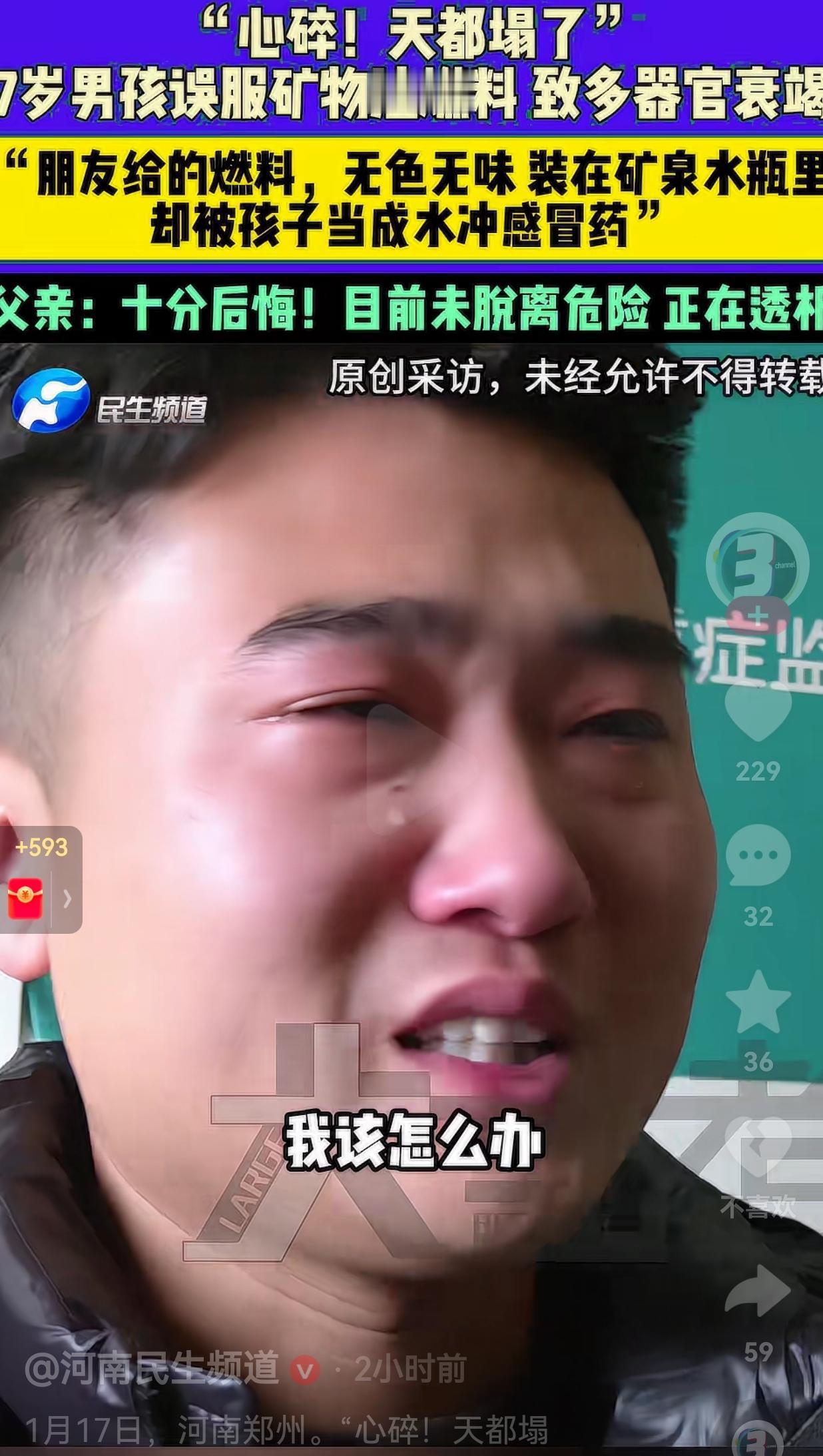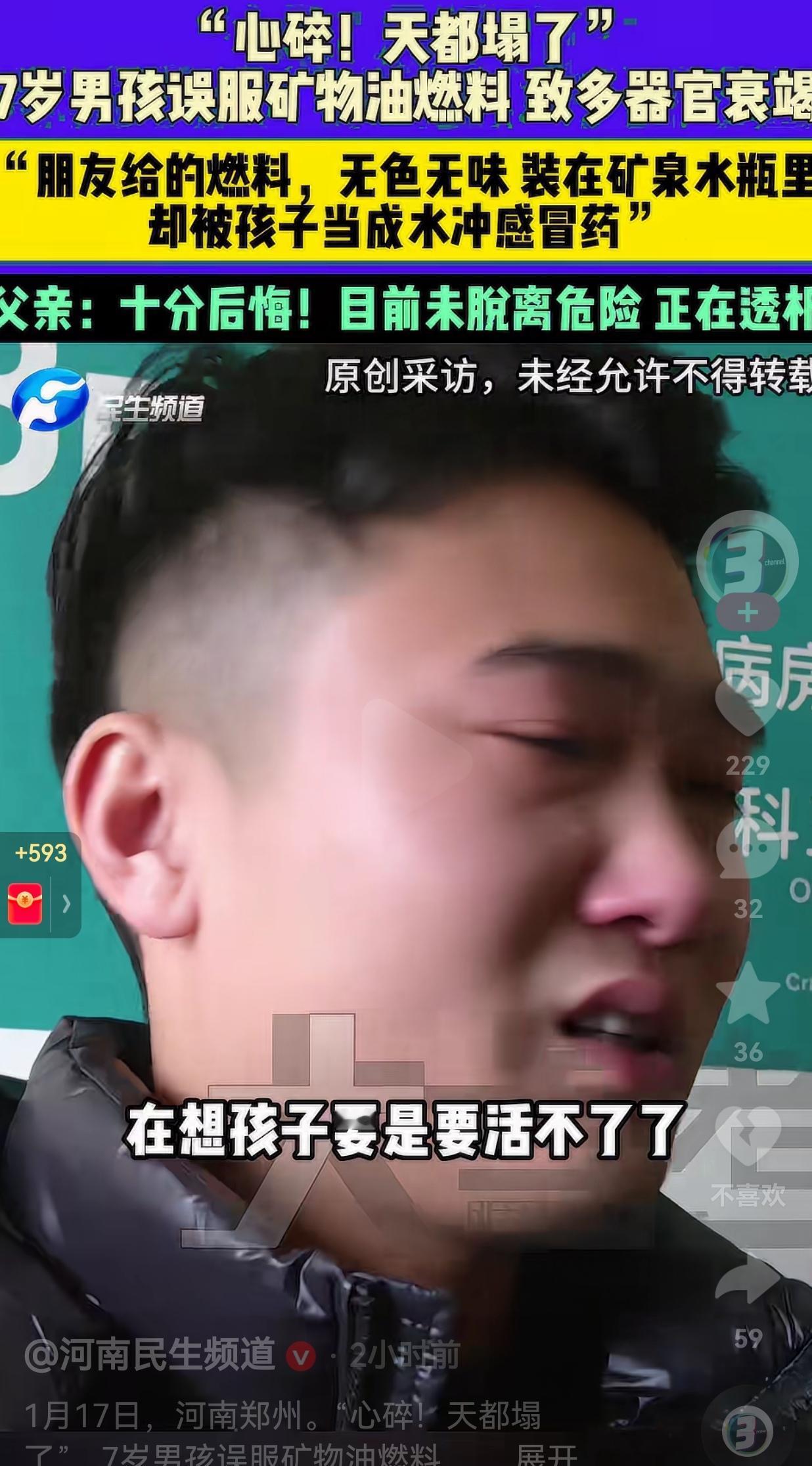 1月17日,河南郑州一位爸爸在接受采访时,整个人都是崩溃的,眼泪止不住地流,嘴里反复念叨着:“我当时心碎,天都塌了。在想孩子要是活不了了,我该怎么办……” 原来,他7岁的儿子因为感冒,自己倒了点药粉在碗里,想找水冲开喝。 孩子一眼就看到了桌上的矿泉水瓶,里面装着无色无味的液体,跟水一模一样。 他根本想不到,这是爸爸的一个朋友开火锅店用的矿物油燃料,这是朋友送给他爸爸的,爸爸没有注意,随手就把燃料装在矿泉水瓶里放在了家里。 最要命的是,这个燃料是无色无味,肉眼根本分不清,到底是燃料还是矿泉水。 因此,孩子把燃料倒进碗里冲了药,搅拌均匀后,由于没有尝出来异味,他就这么喝了下去。虽然孩子喝的并不多,也就不到10毫升,却成了致命的剂量。 据孩子的爸爸讲述,一开始并没有不良反应,直到过了一个多小时,孩子开始呕吐,这才被紧急送往医院。 一开始爸爸还不知道是怎么回事知道检查结果出来,爸爸瞬间崩溃:燃料已经进入血液,导致多器官衰竭,孩子甚至出现了意识模糊,连爸爸都认不出来了。 现在孩子还在重症监护室里靠透析维持生命,没有脱离危险。 网友看到后评论说:“看完心里堵得慌!爸爸也太疏忽大意了,矿泉水瓶怎么能装危险品啊?孩子哪分得清!” 也有的网友分享自己的经验:“安全教育大于天,真的要天天说!我每天都跟娃念叨不认识的东西不能吃不能喝,现在他拿东西先问我。” 还有的网友说:“宁愿多花两分钟找个专用瓶子,也别图省事害了孩子,这教训太惨痛了。” 这件事也给所有家长敲响了警钟:家里的危险物品,绝对不能装在食品或者是饮料瓶里。还有就是所有危险物品,一定要放在孩子够不到的地方。 我知道,很多家长跟这位爸爸一样,平时忙忙碌碌,觉得这么巧的事情不会发生在自己的身上,孩子肯定不会有事的。 但这件事告诉我们,不怕一万就怕万一,万一真的发生时,代价是我们承受不起的。 最后,希望这个7岁的孩子能挺过这一关,也希望所有家长都能引以为戒。千万别让一时的疏忽,成为一辈子的痛。 (信息来源:河南民生频道)