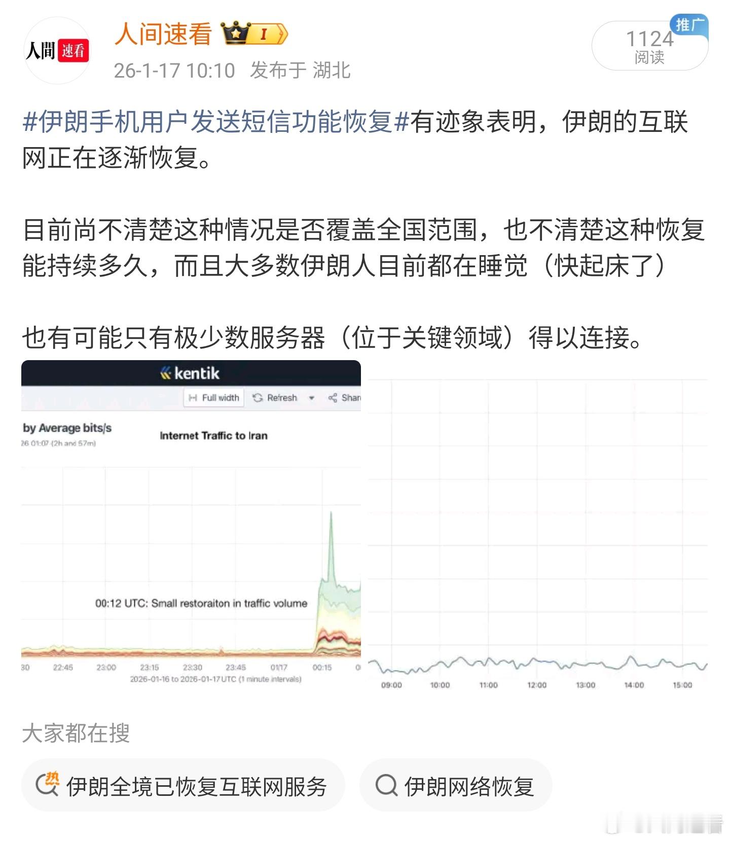 伊朗媒体称境内网络服务部分恢复伊朗网路监测机构NetBlocks的数据显示,经过200小时的断网后,伊朗今晨的网络连接率出现微弱上升。但整体网络连接率仍仅为正常水平的2%左右,且没有迹象表明网络接入会得到有效且持续的恢复。伊朗法尔斯通讯社称,伊朗将逐步、分阶段放宽通信限制措施。第一阶段包括恢复发送短信的功能,随后全面开放国内互联网和本地通讯应用的使用权限。据伊朗官方媒体报道,第三阶段当局计划恢复用户对国际互联网的访问权限。网络恢复还早,慢慢来
