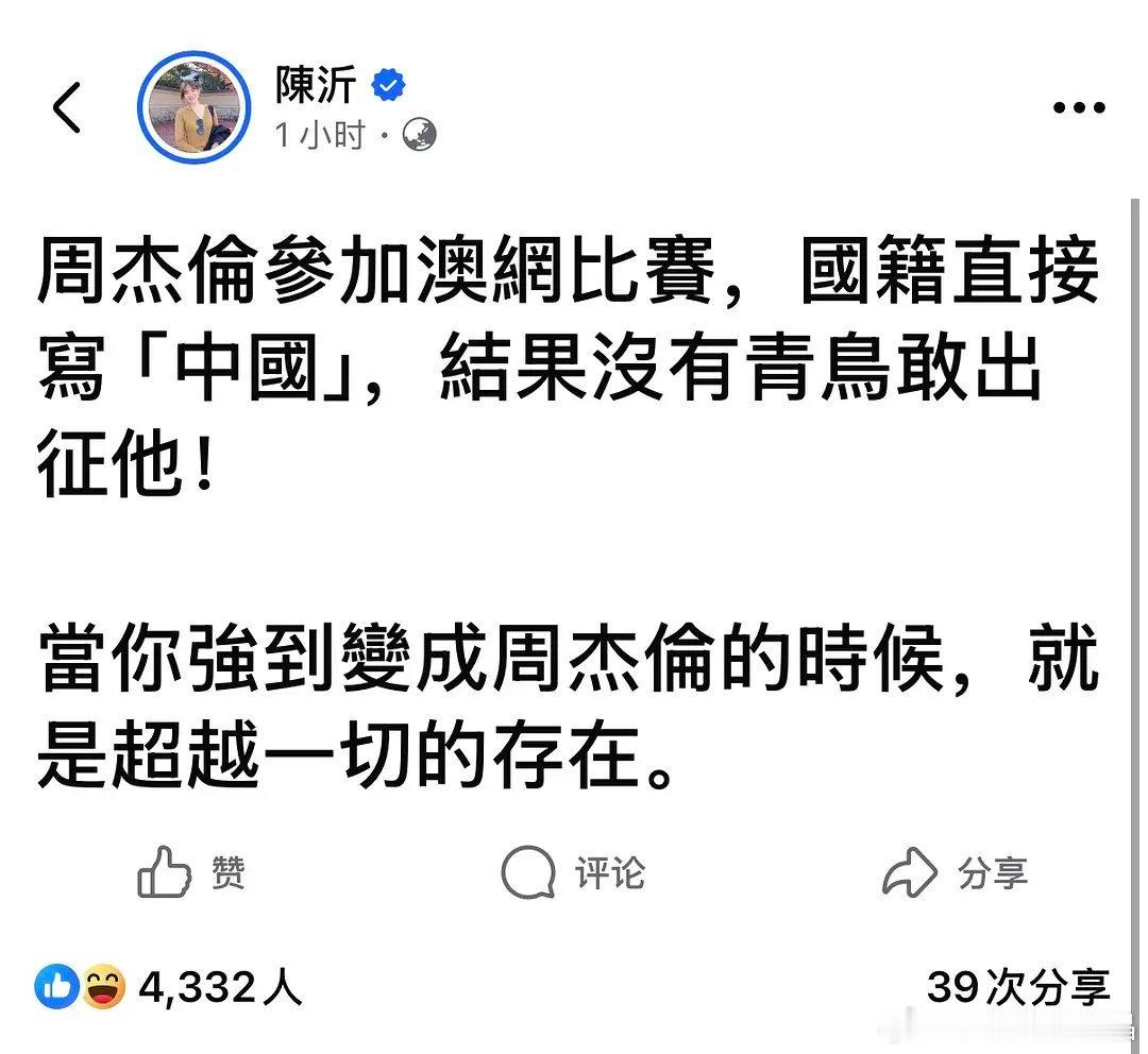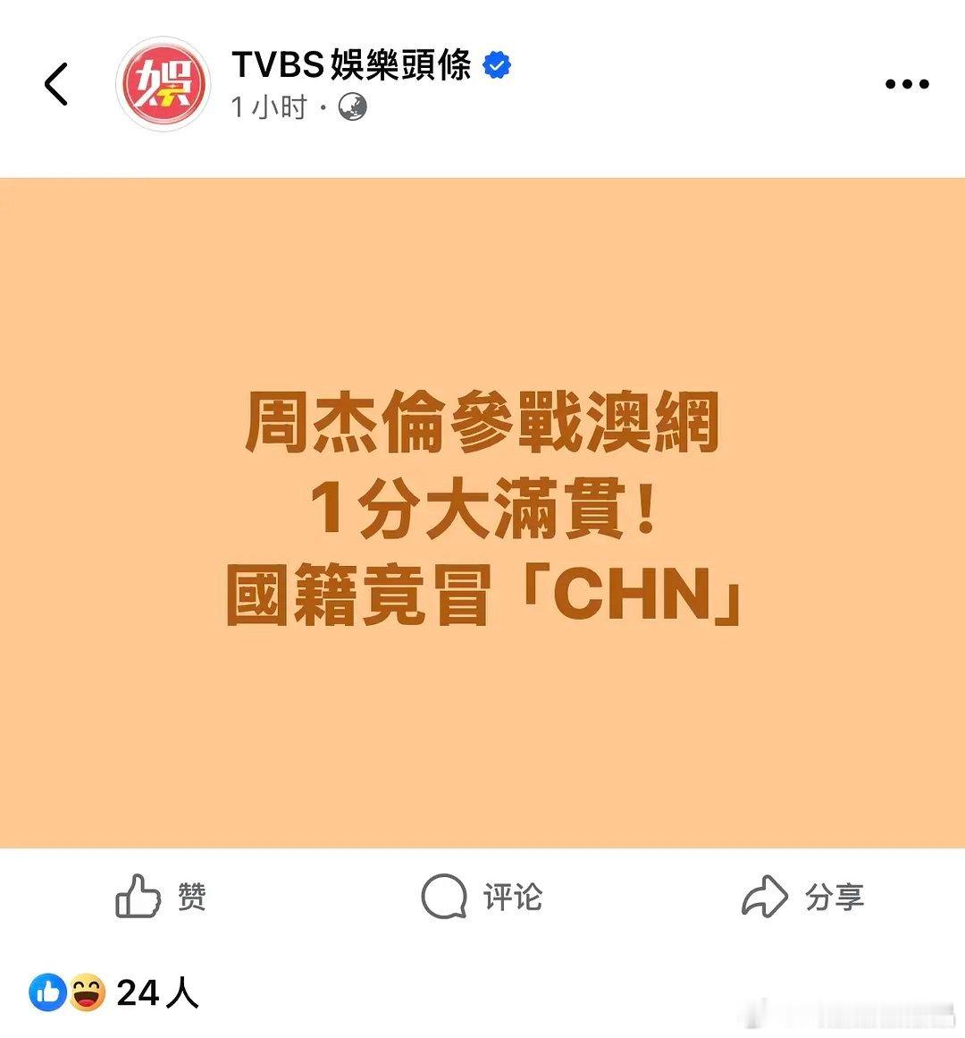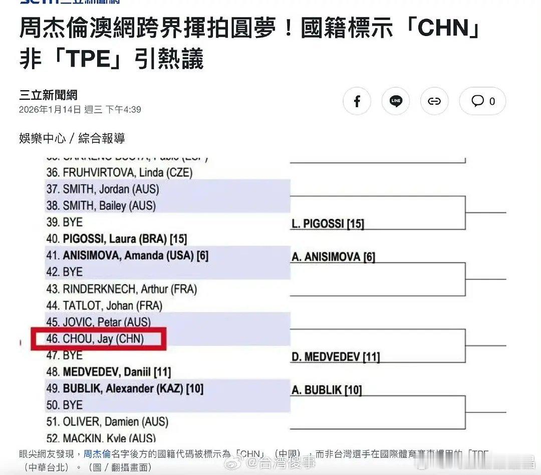 周杰伦参加澳网,国籍用的是CHN(🇨🇳),周董觉悟不错。台湾媒体jjyy的挺多。