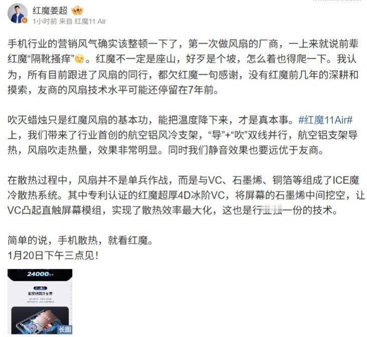 【红魔产品经理姜超:所有目前跟进了风扇的同行,都欠红魔一句感谢】红魔游戏手机产品总经理姜超发文称,手机行业的营销风气确实该整顿一下了,第一次做风扇的厂商,一上来就说前辈红魔“隔靴搔痒”。红魔不一定是座山,好歹是个坡,怎么着也得爬一下。他认为,所有目前跟进了风扇的同行,都欠红魔一句感谢,没有红魔前几年的深耕和摸索,友商的风扇技术水平可能还停留在 7 年前。他表示,吹灭蜡烛只是红魔风扇的基本功,能把温度降下来,才是真本事。红魔 11Air 上,团队带来了行业首创的航空铝风冷支架,“导”+“吹”双线并行,航空铝支架导热,风扇吹走热量,效果非常明显。同时红魔的静音效果也要远优于友商。据此前官方预热,红魔游戏手机将于 1 月 20 日发布红魔 11 Air 手机,该机将是“行业唯一内置风扇的 AIR”,搭载“驭风 4.0”主动散热风扇。该机拥有“行业首创”的航空铝风冷支架,具备高效风冷散热通路;同样“行业首创”的超厚冰阶 VC,均热能力提升 47%,采用双面凸起冰阶设计、超高密度毛细架构,热循环效率号称远超普通 VC。总体来看,该机拥有全新 ICE 魔冷散热系统,包含航空铝风冷支架、主动散热风扇、冰阶 VC 和屏下石墨烯铜箔,官方更宣称是“同档散热天花板”。