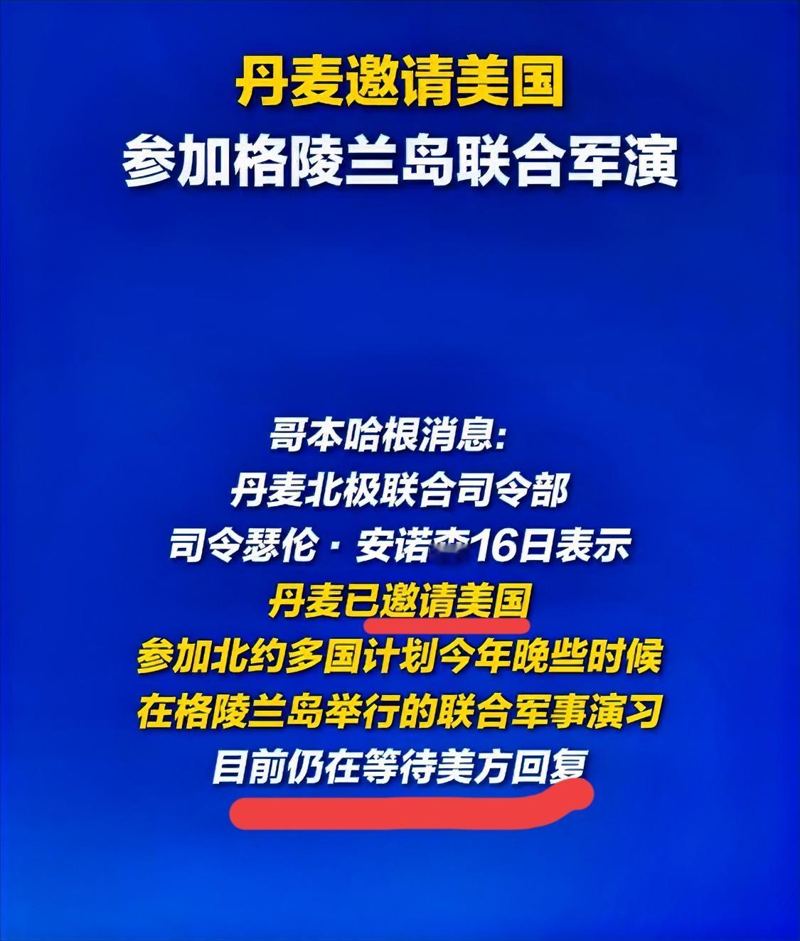 丹麦想给特朗普政府出难题,诚邀美军加入格陵兰岛的“保卫战”军演…… 丹麦这步棋走的妙啊!据新华社报道,丹麦北极联合司令部司令瑟伦·安诺森在1月16日表示,丹麦已邀请美国参加北约多国计划今年晚些时候在格陵兰岛举行的联合军事演习,目前仍在等待美方回复。 这下美国犯了难!现在全世界的人都知道准备举行的格陵兰岛军演,就是为了防止美军武力攻入的“保卫战”,尽管丹麦有实力的欧洲伙伴们派去格陵兰岛的都是做样子的。(法、德各派了15人、英仅派了1人……) 美国同意派兵参与吧,总不能演自己打自己;不同意去吧,美国又是北约的带头大哥,会破坏北约的团结。 总之,格陵兰岛的国防和外交虽由丹麦掌管,但丹麦和欧洲在军事上与美国差距悬殊。因此,丹麦此举,意在“将对手纳入自己设定的规则”。在展示主权的同时,将双边领土争议转化为多边同盟事务,增加美国的行动成本和顾虑。 只是,连国际法都置之不理的特朗普,会把丹麦的小把戏和欧洲的假团结放在心上吗?