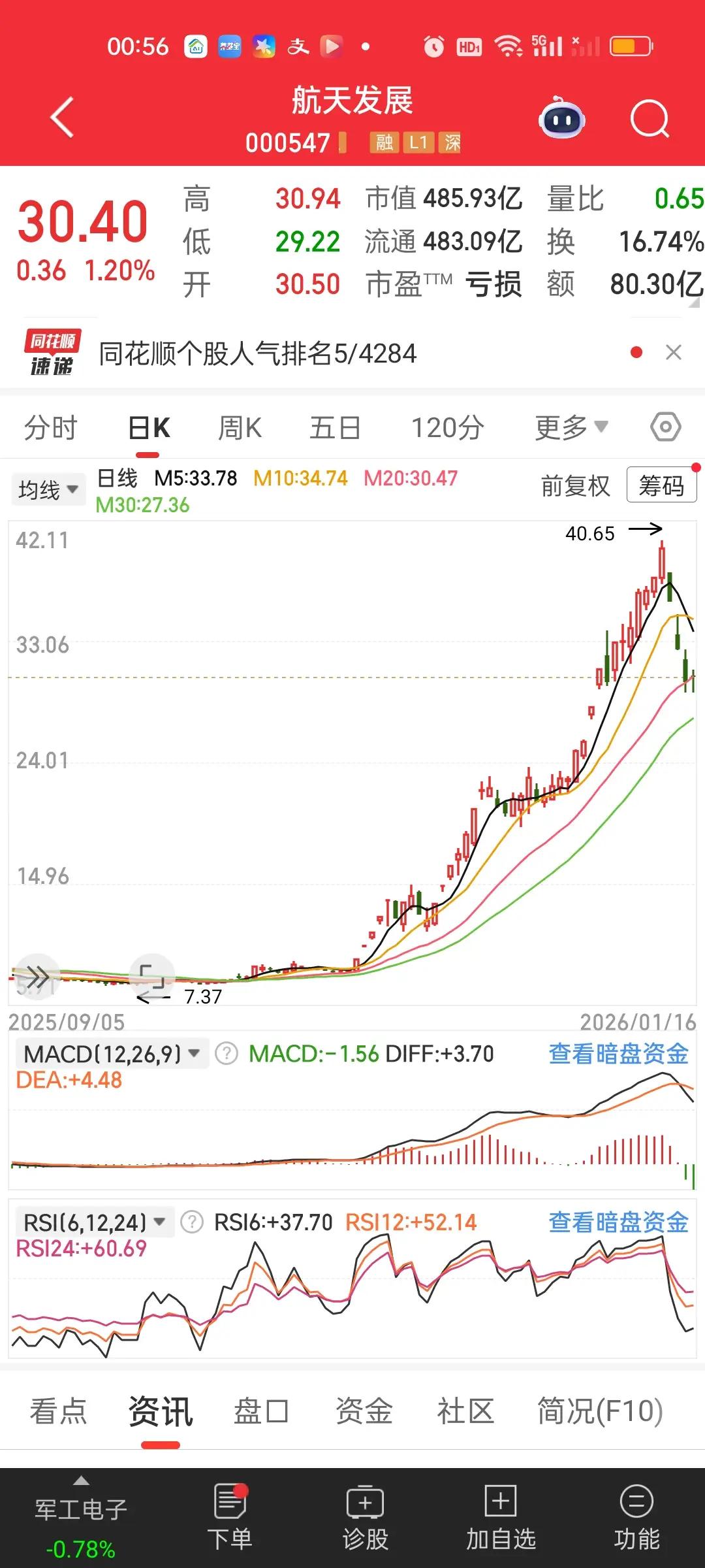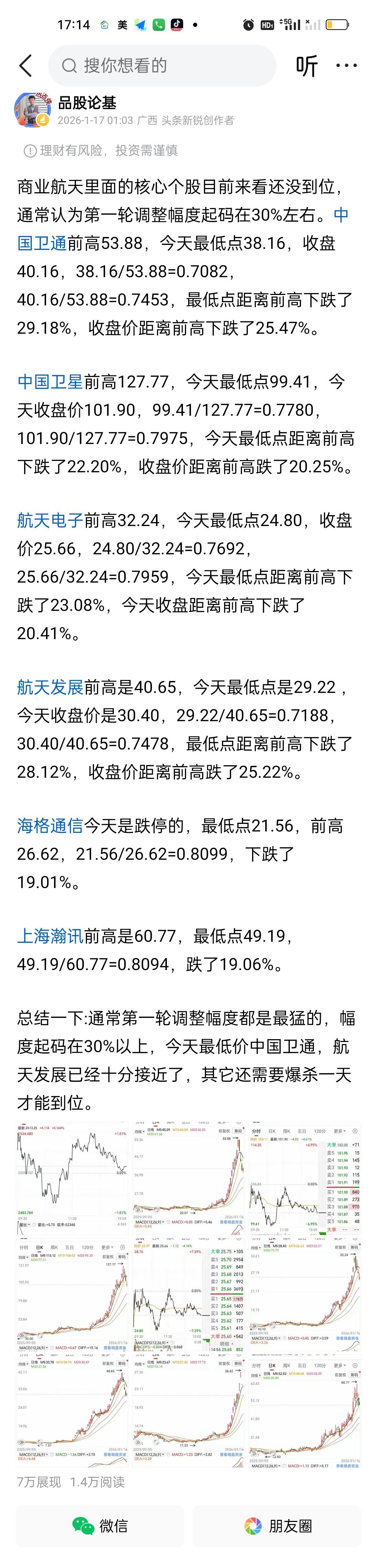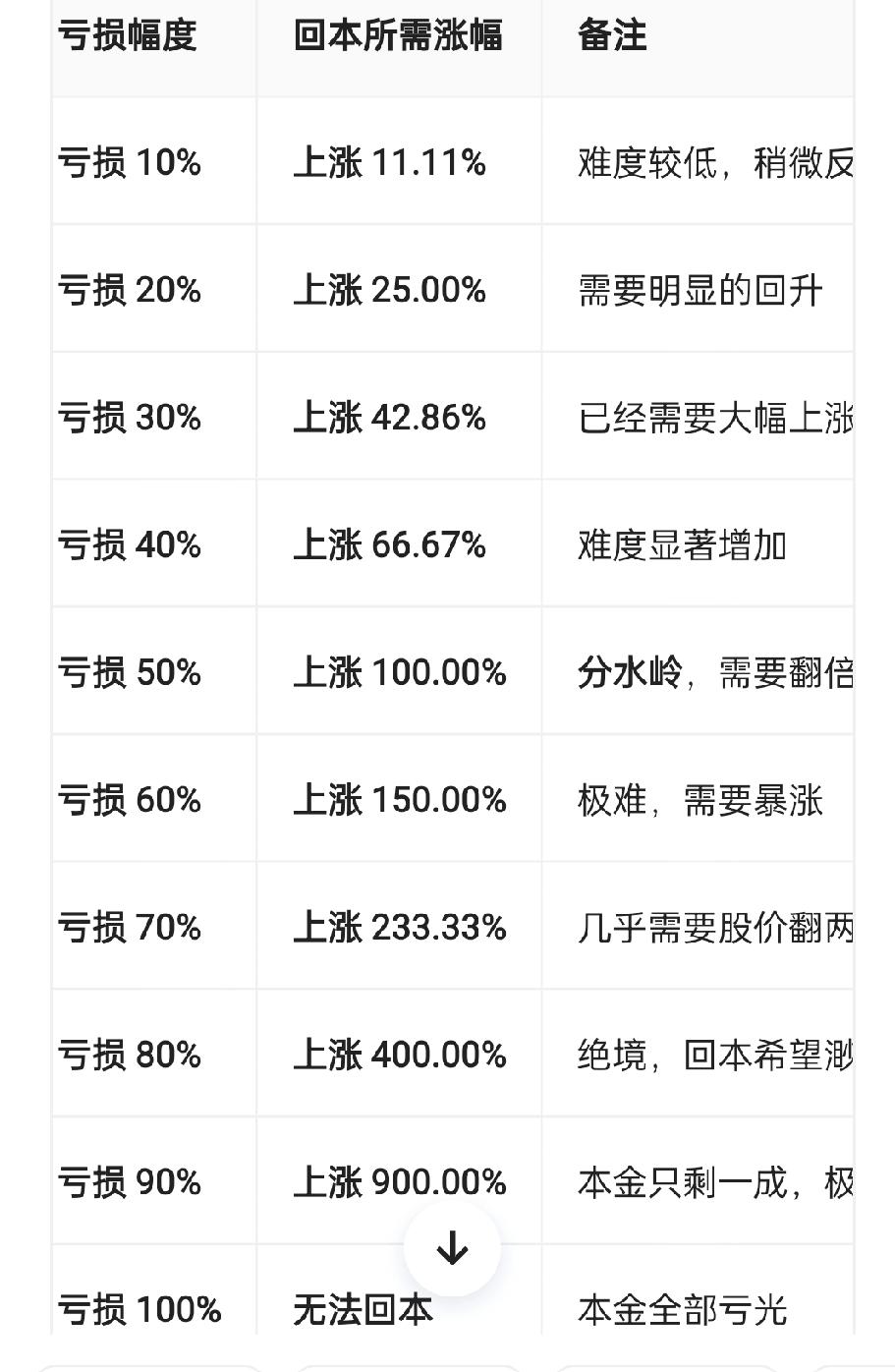 前面我们说过啊,假如一只个股它一直单边上涨,涨到一定的高度肯定会有回撤,它的第一次回撤我们保守估计最低都要有30%以上,所以第一轮回撤一定是所有回撤里面最猛最凶狠的,不仅速度快,跌幅大,无反弹,更让人没有时间思考。 30%的回撤,往往在3--5个交易日就完成了。你如果刚好满仓追高在最高点附近买入,那这30%的跌幅你就吃的结结实实的,躲都躲不掉。第二轮,第三轮以后的每轮下跌不会再像第一轮这么猛烈,甚至阴跌1个月都有可能,但不会再看到几个交易日大跌30%的画面了。所以第一轮暴跌能躲过去是最好的,躲不过去就把仓位降到最低,也可以避免一些损失。 我们可以清楚的看到商业航天几只核心个股,周五最低点已经十分接近30%了,所以下周一再大跌一下基本也就到位了。刚好三十二号卫星发射的消息出来了,利用消息打压一波也是很好的,敢砸就敢吸。 一只股票下跌30%后,需要上涨约42.86% 才能回本 。很多人会误以为跌了30%只要涨30%就能回来,但这是错误的。举个例子:假设你10元买的股票,跌了30%变成7元。你的资产缩水了。计算逻辑:现在要从7元涨回10元,这3元的涨幅是相对于7元(当前本金)来说的,所以需要的涨幅高达42.86%。