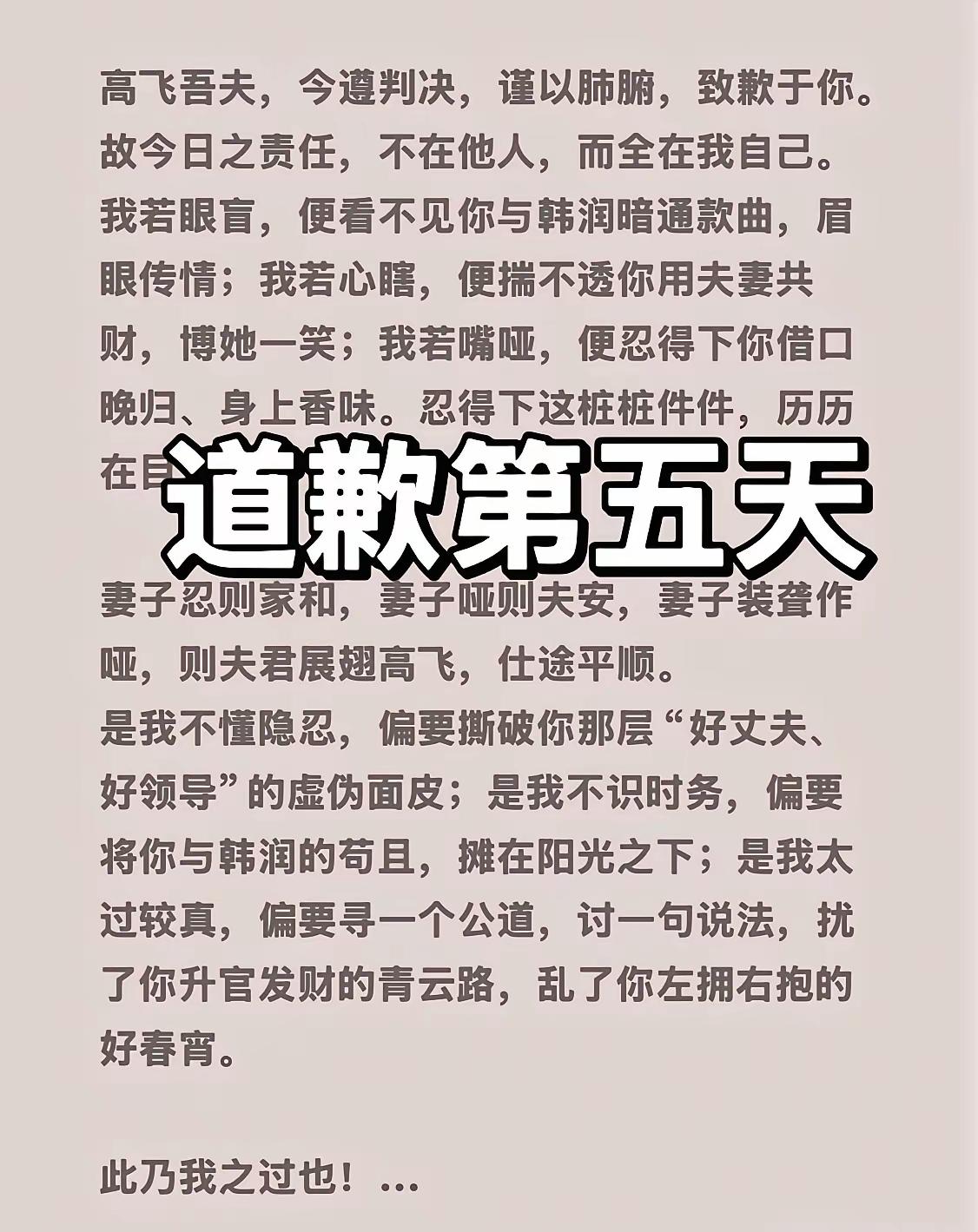 来了来了!道歉视频第五天,高某单位抵挡不住铺天盖地的压力终于做了回应:之前已党纪处分,现已对其停职调查,感谢社会各界的批评和监督! 第一次看道歉视频看的浑身舒畅,简直比任何爽剧都爽!娜姐也是变着花样的道歉,各种反讽和阴阳,那语言真是让人拍案叫绝! 最绝的我感觉还是第五天的文言文,这文案可堪称讽刺的天花板,是“不懂隐忍、不识时务才扰了他升官发财的青云路、乱了他左拥右抱的春宵梦”,哈哈太有才了! 看着这道歉文案,不得不说娜姐这名字起的也很有气势,这一下果真涅槃重生了! 高飞对不起