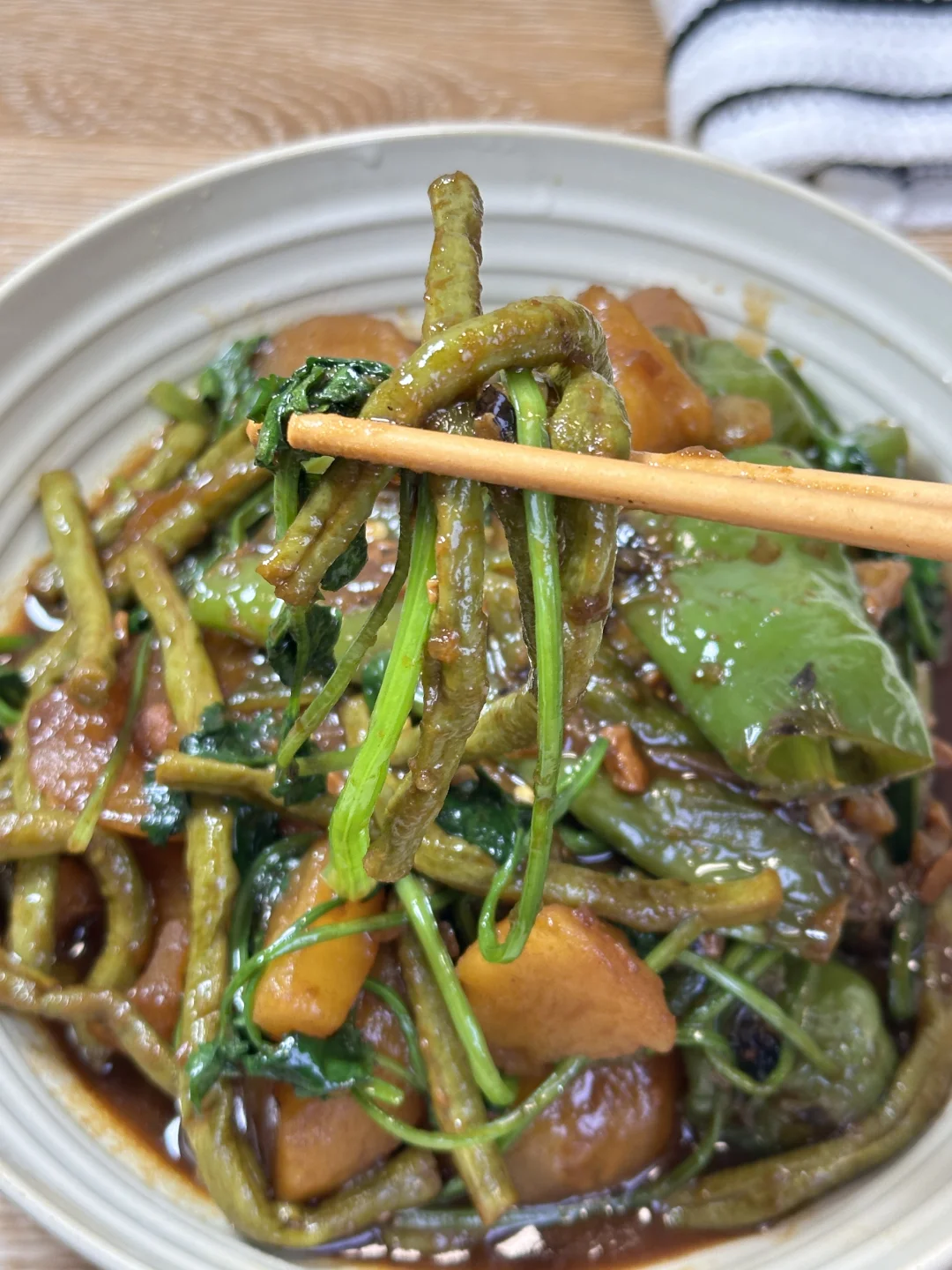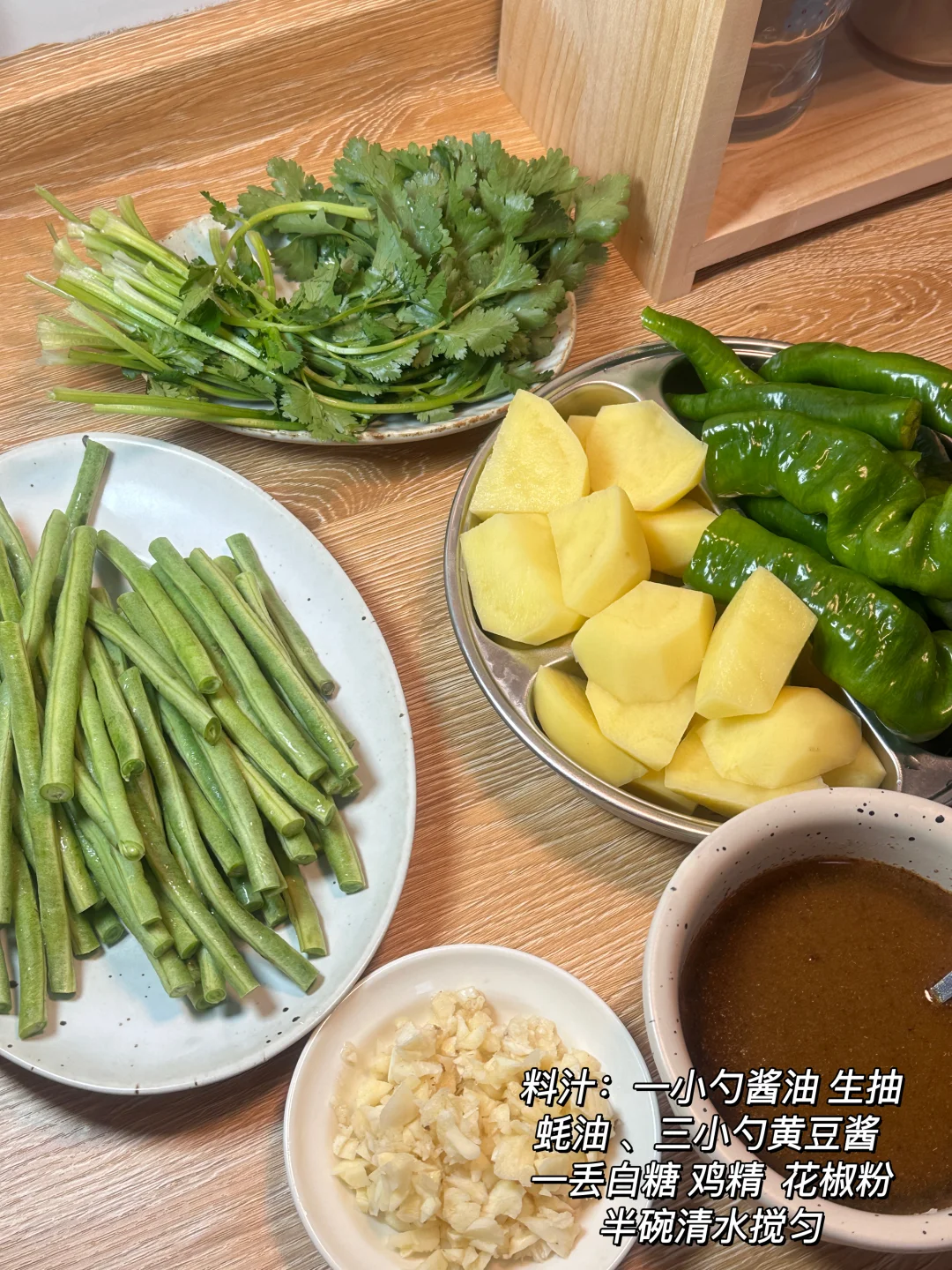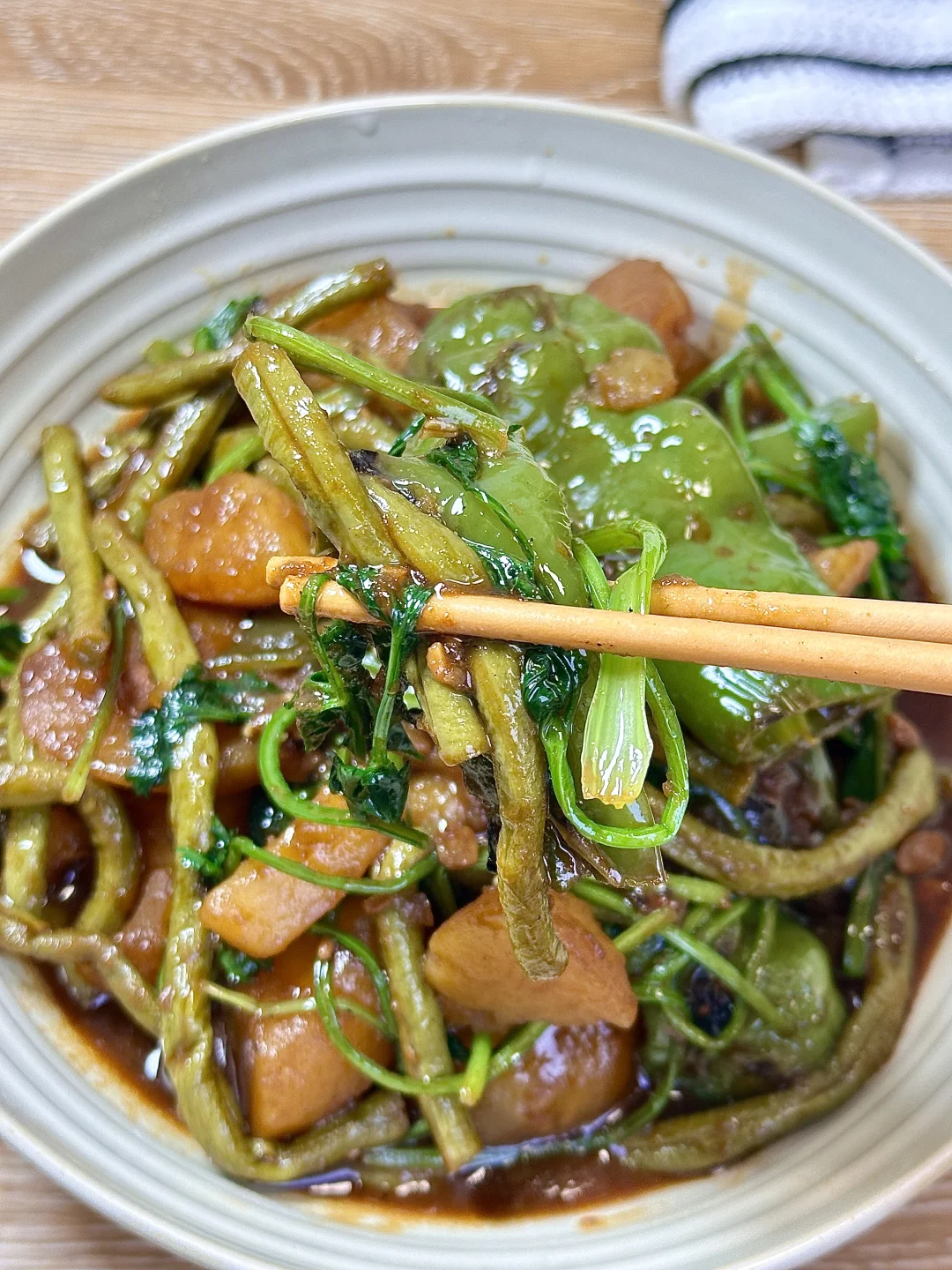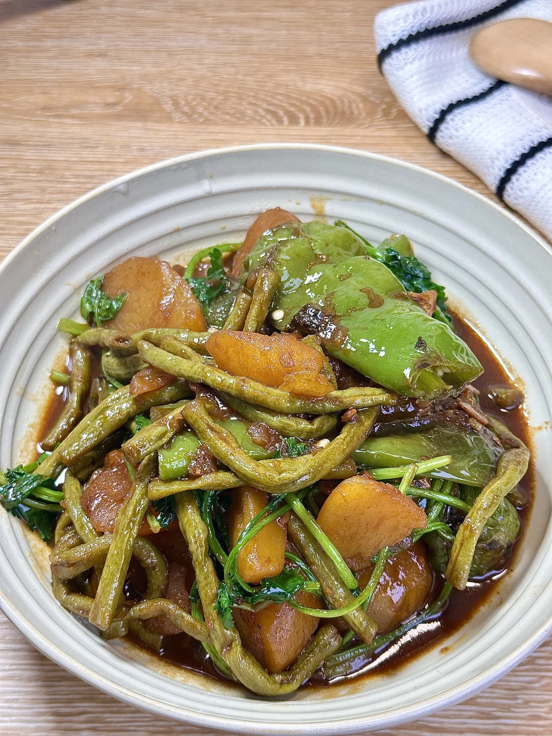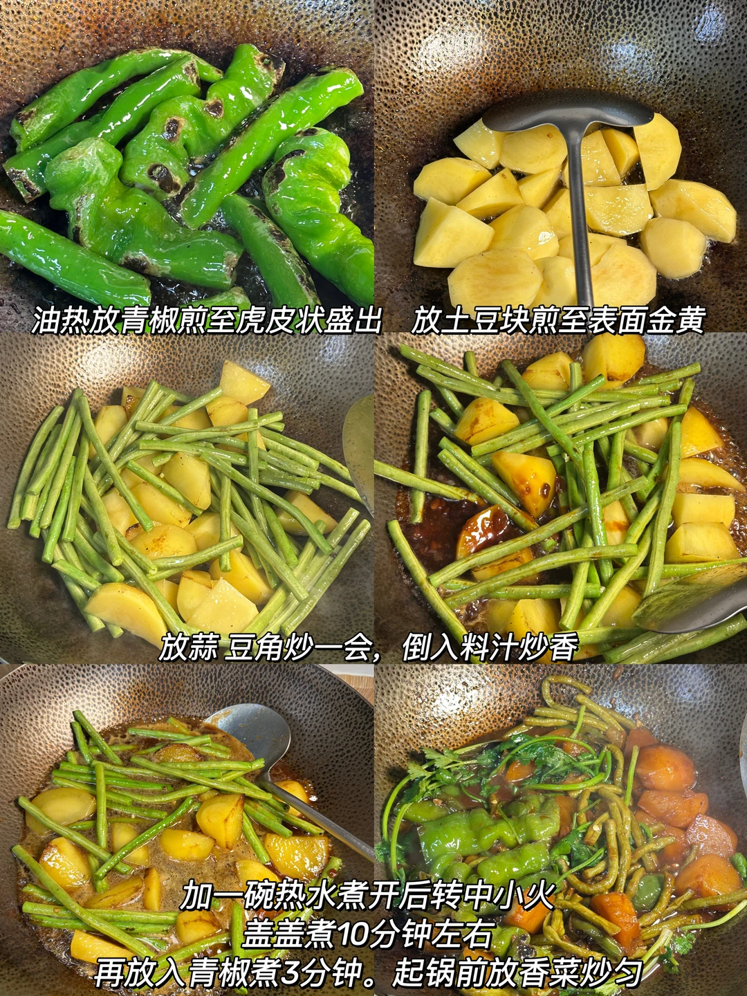 土豆粉糯,豆角入味,青椒带点焦香,每一口都裹满酱汁,小朋友说豆角好好吃[偷笑R] ✨食材:豆角 土豆 青椒 香菜 蒜 1️⃣锅里倒油,放入青椒煎出虎皮状盛出,放入土豆块煎至表面金黄,放蒜和豆角翻炒一会,倒入料汁炒香。 2️⃣:加一碗盖过食材的热水煮开,转中小火盖盖煮10分钟放入煎好的青椒,继续煮3分钟,加香菜翻炒均匀。 好好吃饭🖖🏻