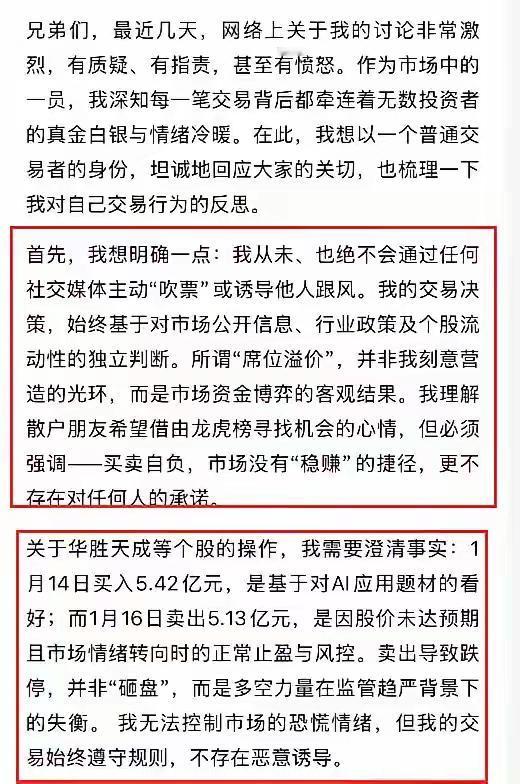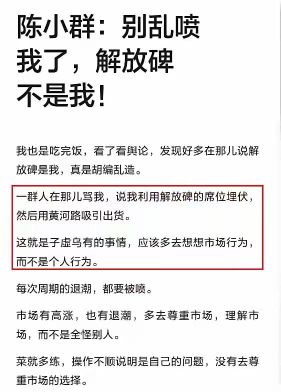 全网都是对陈小群的口诛笔伐,这样公平吗? 从昨天到今天,一进头条,到处都能刷到无数人,尤其是评论区对陈小群的口诛笔伐,尤其是说 重庆解放碑 是他或者他们团队的,先默默建仓,再利用黄河路席位的知名度大单封板,引导散户跟风,三四个板之后人家默默出货,把散户挂在了旗杆上,或者后面三四个跌停,让大家损失惨重。 网上也流传,他本人出来澄清了,可不管哪个帖子下面的留言,大部分都还是骂声一片。 咱无法判断网友的怀疑是不是真的,也无从考证他本人的澄清是不是真的,但是可以肯定一个事实:凡是跟上陈小群吃了大肉的,大部分都是不会骂他的;不管位置再高,不自己去判断风险与收益概率的,被大套的,几乎全都骂人家。 如果站在他的角度去想想,真的感觉很郁闷,用他本人那无奈的话总结就是:有人的地方就有江湖。 首先: 他不管进哪只票,他本人没有去吹,也没有鼓动谁去跟,大部分都散户都是在龙虎榜上看到的或者很多自媒体上看到的,然后就去无脑追。 其次:他进的很多票,都是在第一波或者第二波的首板或者二板进去的,也基本都是作为主封进的,但是第二天由于众多散户还有部分游资都是挂单隔夜顶,第二天不是大幅高开就是一字板,一般都会连四五个板,但是这个时候早早进去的已经利润丰厚,很多人都已经开始跑或者减仓了,而你这个时候不管位置高低,不管当天市场情绪如何仍然还是蒙着头追进去,这个时候用脚趾头想想,都已经是风险大于机会了,亏了也很正常。 第三:还有滑稽的人说 他走之前应该跟至少大家说一声吧,大家好有个心理准备,也不至于死扛几个跌停。看到这样的声音,简直无法想象:如果他准备卖之前说了一声,以现在的自媒体信息传播速度,一会会全网都就传遍了,在车上的所有机构、游子 散户都一窝蜂的挂跌停板出货,外面的资金一股也不敢买了,这样别说三个跌停板,就是七个八个跌停板也不一定能止住,这样的情况就是所有人一起玩完。 不要跟着人家赚了就捧为财神,给人家套各种人设,各种吹;跟着亏了又到处骂人家,各种猜测各种贬低。 都是成年人了,不管是新股民还是老股民,都有赚钱的阶段,也有大亏的阶段,市场就是这么残酷,怪只能怪自己能力不行,分辨不出哪里该跟哪里不能跟,赚的时候就大肆吹捧,亏的时候就各种贬低,这样只能显示出自己的本性。 理智一些吧……