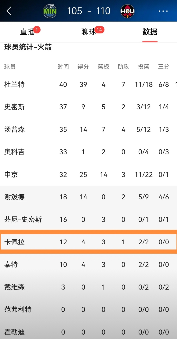 我必须要好好的夸夸火箭中锋卡佩拉!今天火箭在主场以110:105力克森林狼,本场比赛由于亚当斯的缺阵,因此卡佩拉获得了一定的出场时间,他在替补出战的12分钟里,投篮2中2得到4分,还有3篮板1助攻1抢断,他的场上正负值为+8。