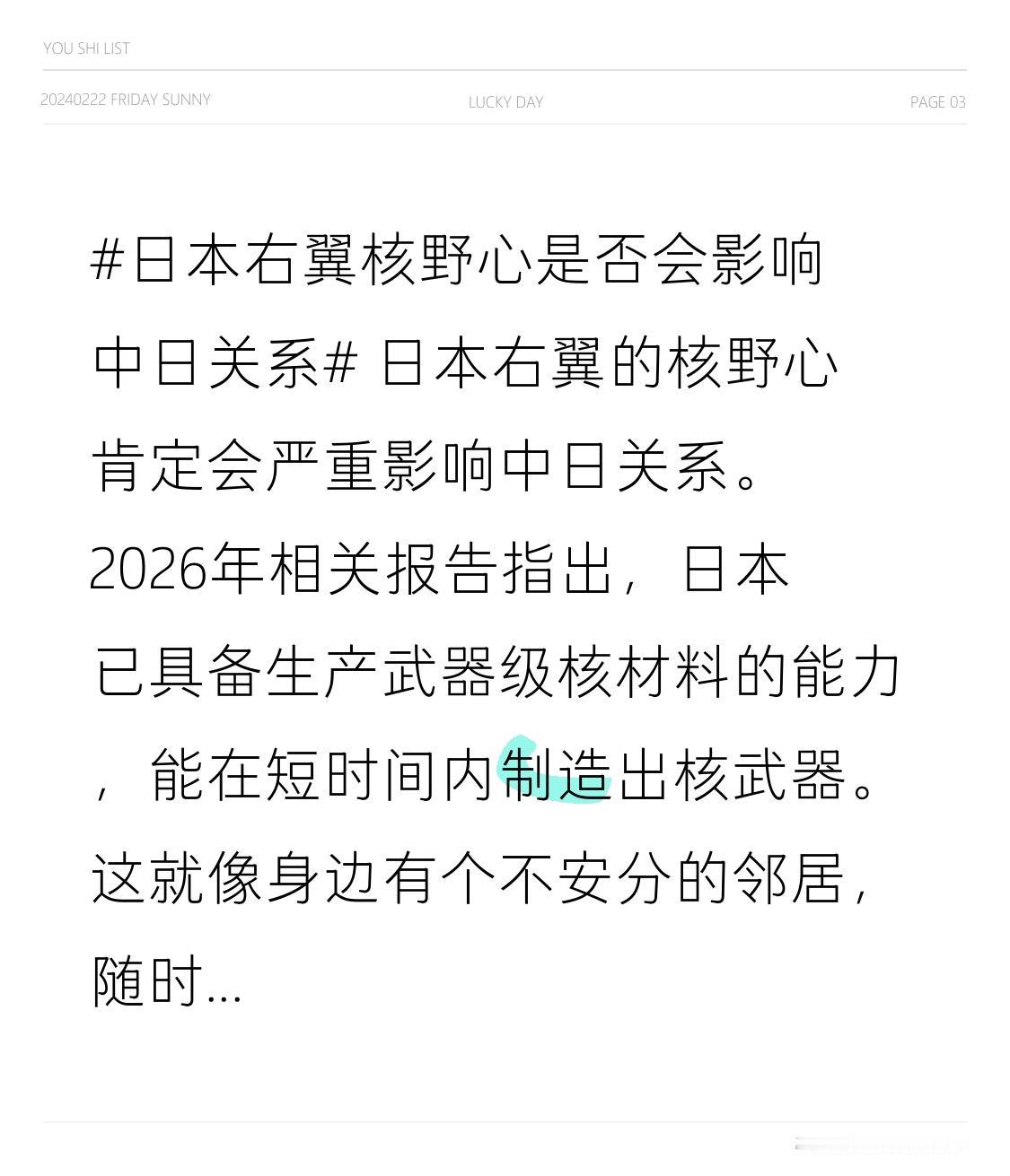 日本右翼的核野心肯定会严重影响中日关系。2026年相关报告指出,日本已具备生产武器级核材料的能力,能在短时间内制造出核武器。这就像身边有个不安分的邻居,随时可能掏出危险武器。 日本右翼保守势力还加速扩军、推进“再军事化”,修订“安保三文件”、大幅提升防卫费、采购进攻性武器等。历史上日本曾侵略中国长达50年,给中国人民带来了巨大伤痛。如今日本再次有危险举动,中国商务部也采取了禁运措施。如果日本军国主义野心失控,不仅威胁亚洲安全,也会害了自己。这种情况下,中日关系必然会受到极大冲击。