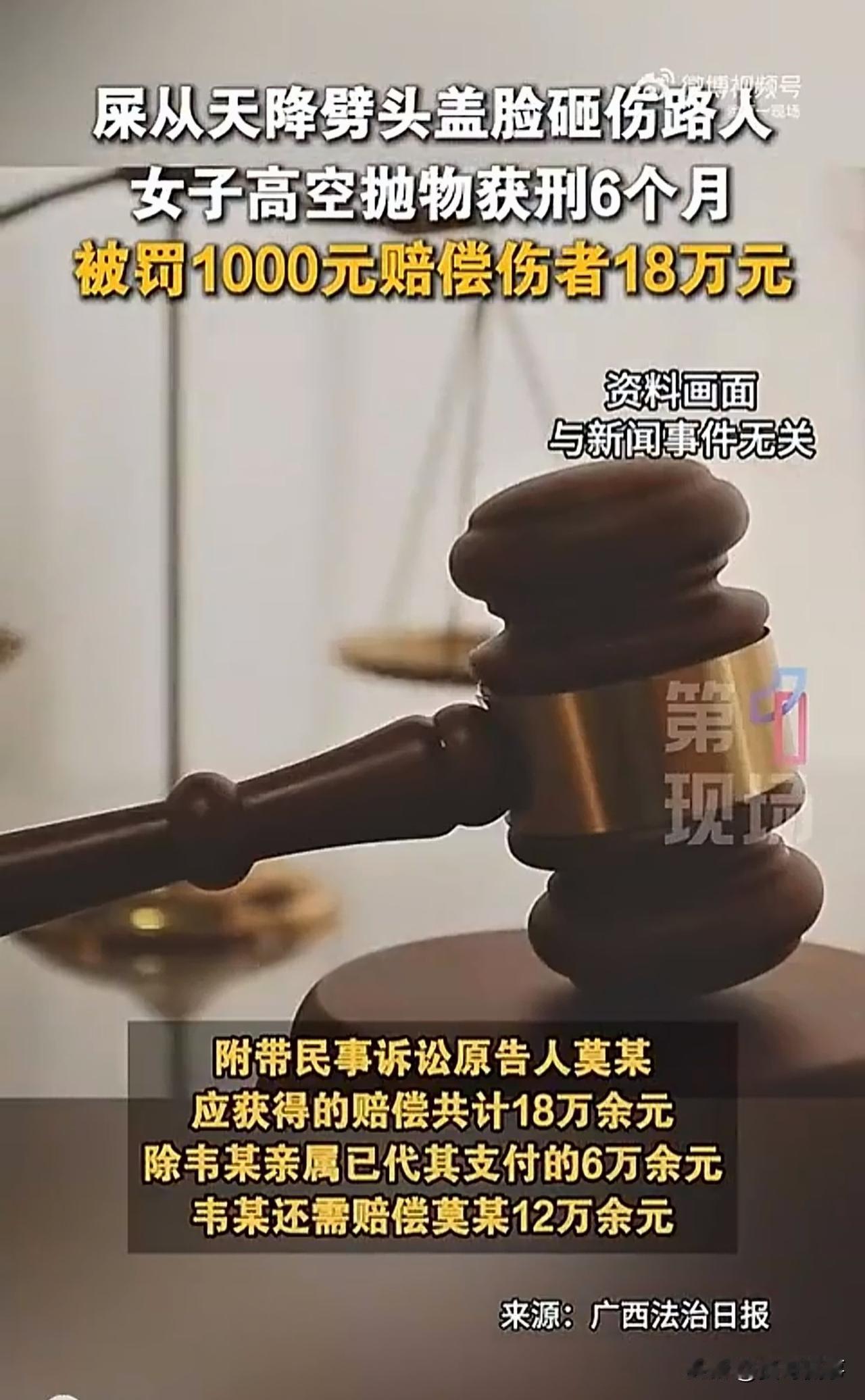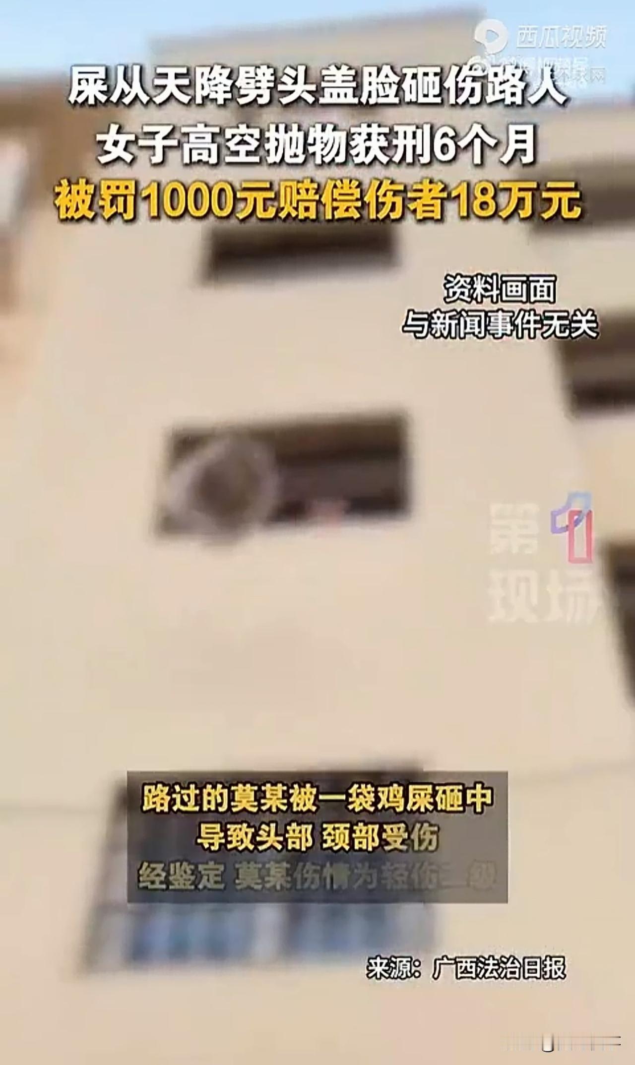 “高空抛屎,必须严惩!”广西来宾,一男子在自家三楼养鸡,为了图方便,他在清理鸡屎装入袋中后,直接扔到楼下,不料砸中路过的行人致轻伤二级。最后,男子因涉罪获刑6个月,并给对方赔偿18万元,男子追悔莫及。 3楼扔袋鸡屎,赔12万还坐半年牢!这事真不是小事 事发当天7点多,男子韦某寻思着把自家3楼楼顶鸡舍的鸡屎清理干净,省得堆久了有味儿。 可谁曾想,为了图省事,在打扫完后,韦某直接把鸡屎装袋扔到了楼下。 而楼下正是人来人往的出行通道!不曾想,这袋臭烘烘的鸡屎不偏不倚,正好砸中了路过的莫大哥。 莫大哥随即被送往医院进行治疗,先后跑了好几家医院,前前后后花了18万余元。 后来,莫大哥的家属为此时报了警,民警接到报警后,电话通知韦某去配合调查,韦某当场如实交代了扔鸡屎砸人的事实。 案件随即被移交至检察院,检方以高空抛物罪提起了公诉。 可能有人觉得,不就是扔袋鸡屎吗?顶多赔点钱,怎么还会涉及刑事犯罪呢? 这就大错特错了!高空抛物可不是“小事”,而是实实在在写在《刑法》中的犯罪行为。 《刑法》291条规定,从建筑物或者其他高空抛掷物品,情节严重的,处一年以下有期徒刑、拘役或者管制,并处或者单处罚金。 韦某从3楼楼顶扔鸡屎,楼下是通行道路,还砸中了人,造成莫大哥轻伤二级,完全符合“情节严重”的标准。 最终,法院综合韦某具有自首等从宽情节,判决韦某有期徒刑6个月,并处罚金1000元,向莫大哥赔偿12万元(总共18万元,韦某家属先行赔偿6万元)。 其实仔细想想,韦某当初多走几步路,把鸡屎拎下楼扔垃圾桶,就不会有这档子事。 图一时省事,结果让自己坐半年牢不说,还得赔12万多,实在是得不偿失。 如今,城市高楼林立,高空抛物的隐患则一直都存在。 有的人觉得“随手一扔没人看见”,有的人觉得“扔点小东西没事”,但这种侥幸心理可能给别人带来灭顶之灾。 要知道,一块小小的瓷砖从10楼扔下,冲击力堪比锤子;一个鸡蛋从20楼扔下,能砸破人头骨——这可不是危言耸听,而是已有相关的案例报道。 所以说,大家不管是住高层还是低层,都得有“底线意识”!要知道,高空抛物害人害己,不仅会让别人受伤破财,自己也可能面临牢狱之灾和巨额赔偿。多走几步路,把垃圾扔到该扔的地方,既是对别人,也是对自己负责。 对此,你怎么看?欢迎大家在评论区留言。