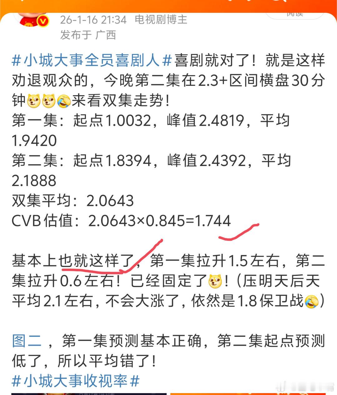 以为是嫌疑人结果是追心上人以为是史冠结果是1.7!《小城大事》目前集均1.775!1月16日cvb收视日报!小城大事1.742,酷云2.0643,系数0.844(昨晚估值正确)前14集集均1.775,明天出来1.685左右,集均又得降低