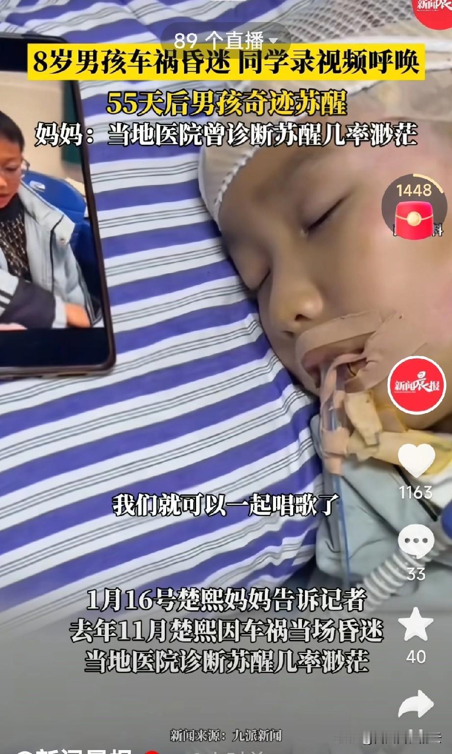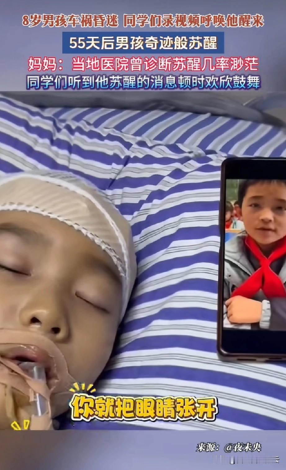 看到这个孩子笑了的时候,我激动的都想哭。 男孩叫刘楚熙,今年8岁,因为出了车祸一直昏迷,在当地医院里,医生跟孩子妈妈说孩子苏醒的希望渺茫。但是妈妈没有放弃,把孩子送到华西医院。 妈妈听取医生的建议,让老师和同学录制音频和视频唤醒楚熙,刚开始的时候没有效果,妈妈就一直放给他听。元旦那天,楚熙听到同学们录制元旦晚会的视频时,短暂得睁眼了。这让妈妈很兴奋,她觉得这个方法有效,信心大增。 老师和同学们也很配合,不断的和楚熙说话,就好像楚熙还在班里,从来没有离开过。终于在楚熙昏迷的第55天,楚熙听到同学们的说话,当一个女孩说完后,他张嘴笑了。 现在妈妈说,楚熙已经苏醒了,会听懂她的指令。老师告诉同学们这个消息后,全班同学都沸腾了,兴奋的又蹦又跳。 孩子们虽然不懂什么是奇迹,但是他们知道自己的朋友醒了,快要回到他们中间了,他们为朋友的康复高兴。这些孩子真好,都这么的纯真善良。还有暖心的老师和不离不弃的妈妈,最重要的是小楚熙也很坚强,在他昏迷的55天里,他是不是也熬的很辛苦呢?幸好,他终于挺过来了,愿他早点康复,早日回到那个温暖的集体。老师和同学们在等着他。 祝福楚熙,也给善良的老师、同学点赞!