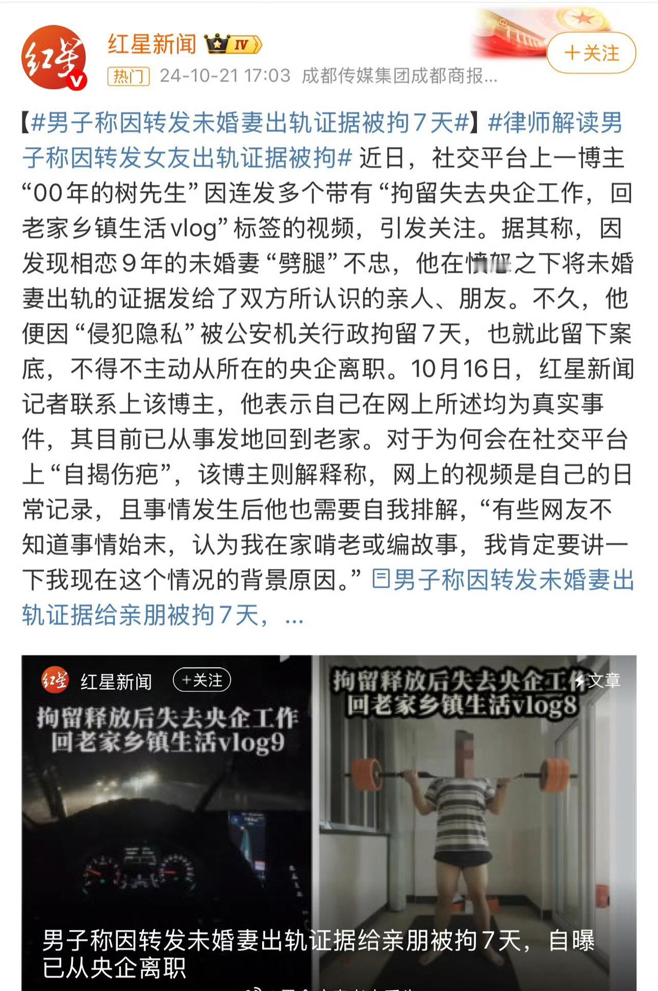 出轨被妻子全网视频道歉男子已经被停职调查?这又是一起典型的性别一换结局反转的社会事件。 因为顺手一查此前的类似情况的报道,只是主角换成了男同胞,结果怎么样? 请看当时媒体报道标题:男子因转发未婚妻出轨证据被拘7天。是不是很震撼?拘留的原因是侵犯隐私,并且因为被拘留后来导致他丢掉了央企的工作。 所以提醒朋友们,不要感觉这个女人这样做效果很好,就像模仿。性别有不同,风险需谨慎。