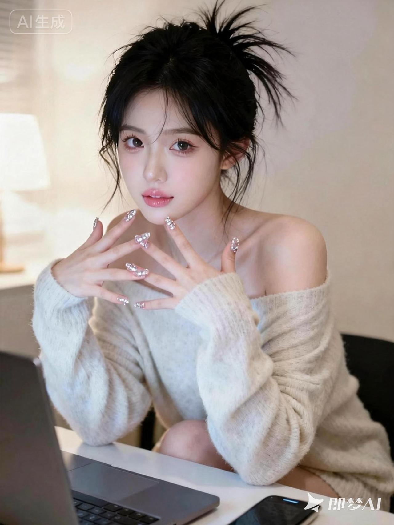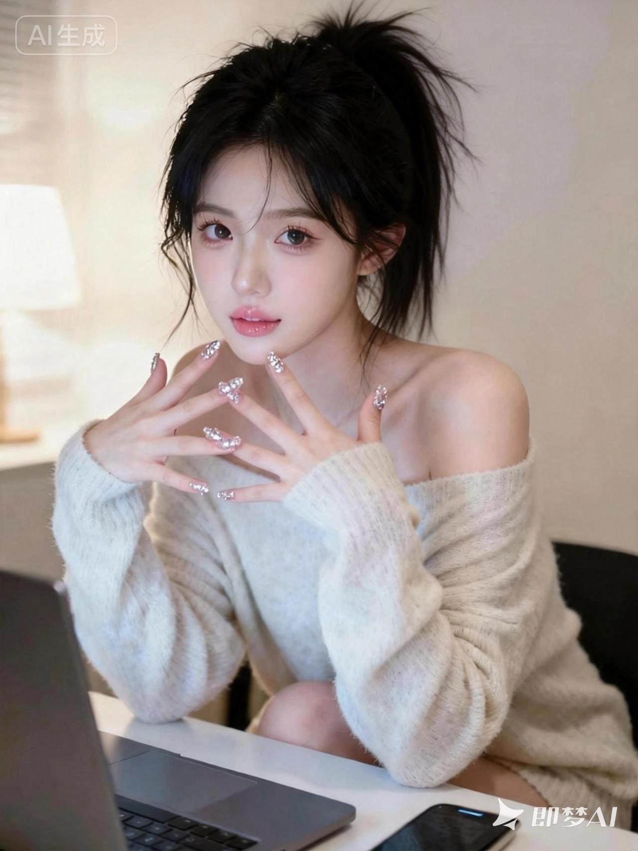 年轻女子,浅米色露肩毛衣,黑色高马尾(带碎发),精致闪钻美甲,坐在桌前(桌上有银色笔记本电脑、黑色手机),室内场景(台灯、浅色墙面、柔和灯光),温柔,气质,慵懒