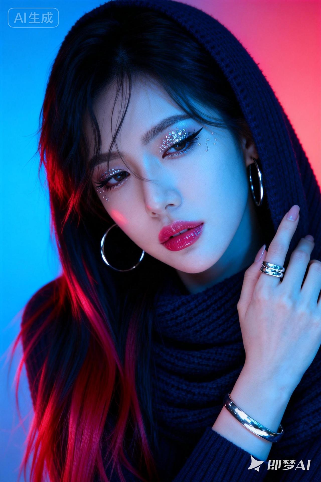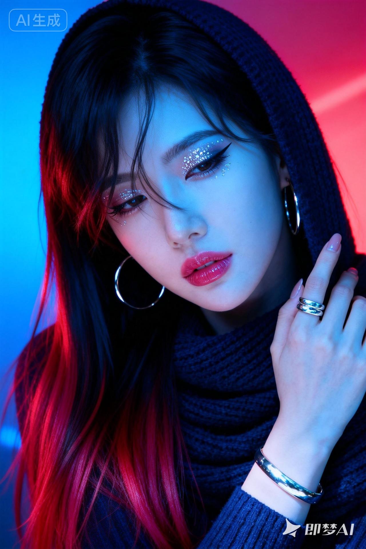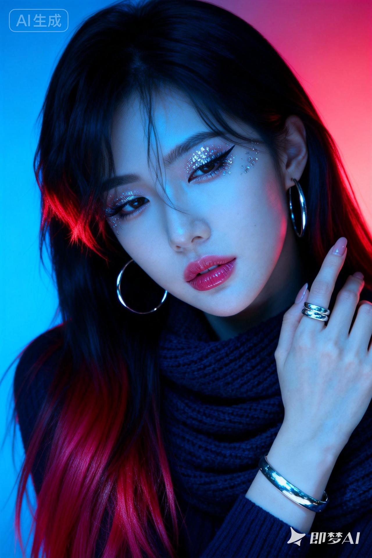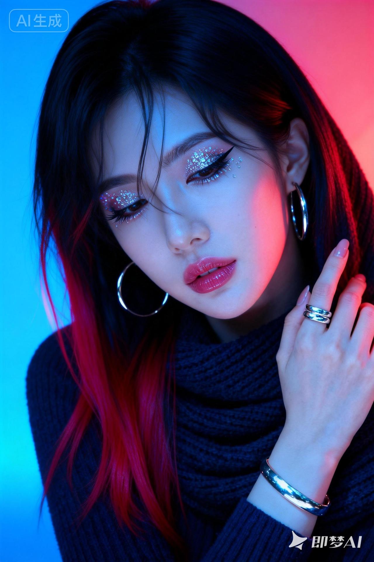 东亚女性,黑红渐变长发柔顺有光泽,发尾晕染玫红调,碎发轻贴脸颊增添慵懒感,发丝纹理清晰且带柔润反光。妆容细节极致吸睛:眼妆为银色碎钻细闪眼影,闪片颗粒细腻透亮,眼头与眼下闪片密集,搭配纤长卷翘睫毛,眼神灵动勾人;唇妆是亮面玫红唇釉,唇面光泽饱满莹润,唇纹自然清晰,色泽浓郁又显冷艳。姿态为微侧略微低头,神态清冷迷离,自带神秘氛围感。
