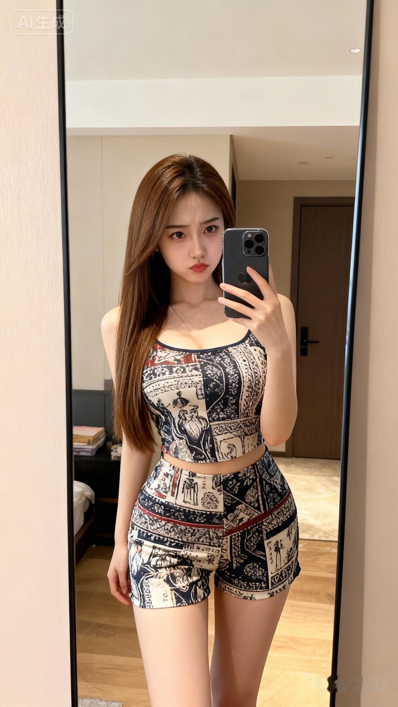 一位纤瘦凹凸有致曲线美的20岁女神散发着清纯温柔气息、身着图案服装的南京美女,她有着一头柔顺的茶色长直头发,正站在房间内的落地镜前,女生做出一副生闷气装可爱的表情