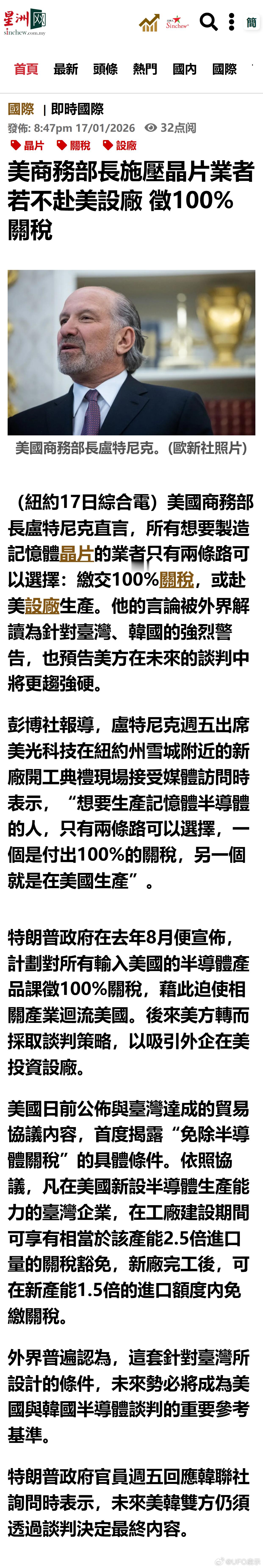 美国商务部长卢特尼克直言,所有想要制造内存芯片的业者只有两条路可以选择:缴交100%关税,或赴美设厂生产。他的言论被外界解读为针对台湾、韩国的强烈警告,也预告美方在未来的谈判中将更趋强硬