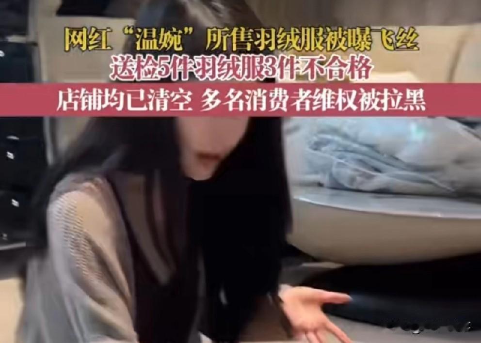 又一大网红卖假货被媒体曝光! 媒体报道网红“温婉”售卖假羽绒服,送检5件中有3件属不合格产品,含量非绒而是对身体有害的飞丝成分! 售卖羽绒服的规格标识明确标注“90%白鸭绒”成分,消费者现场划开发现满是绒丝填充物!目前商家已关闭店铺,多名消费者维权却被拉黑!