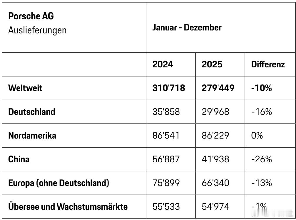 【2025年保时捷全球市场销量为279,449辆,同期为310,718辆,同比下滑10%】据了解,保时捷于2023年创下历史销量新高,全年交付320,221辆新车,至2024年连续四年销量稳定在30万辆以上,这是保时捷时隔四年后再次跌破30万辆,回到2019年水平。车评观察汽车销量