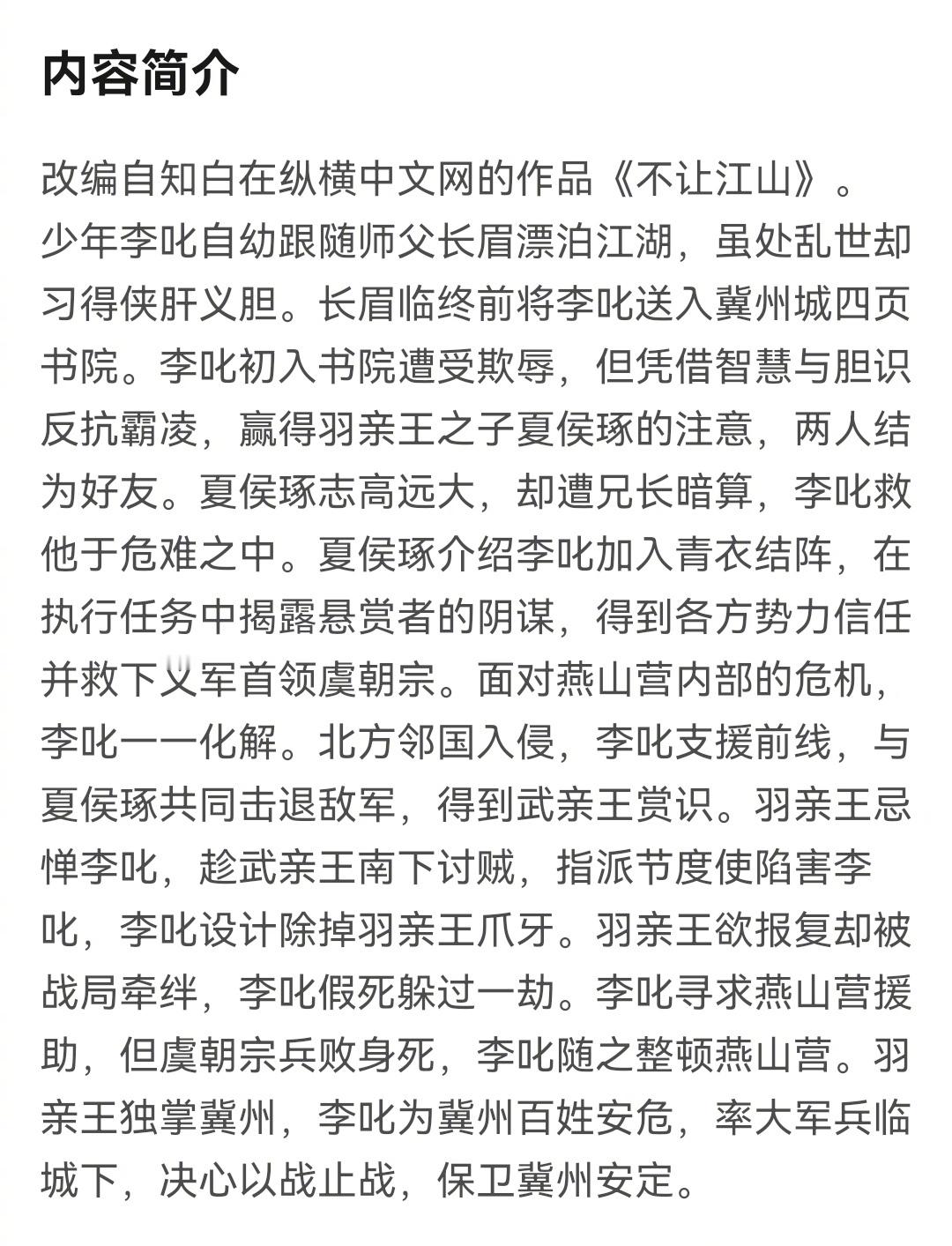 杨洋 新剧《不让江山》,改编自知白纵横中文网作品,导演费振翔(代表作 星汉灿烂),编剧张云霄(代表作 定风波),春节后横店开机。